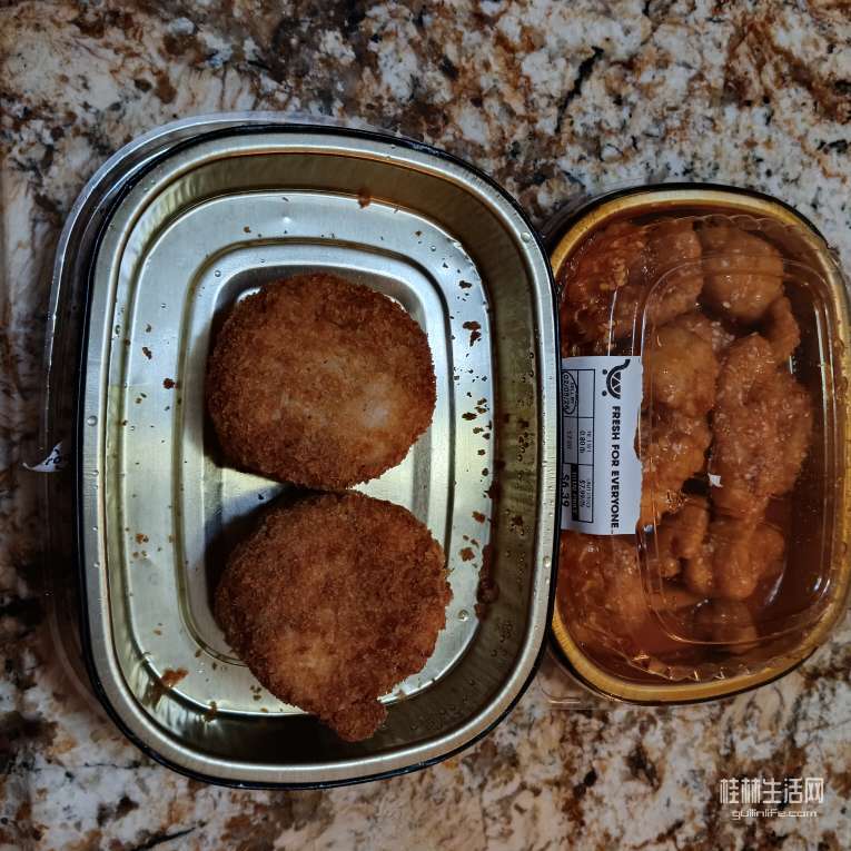 顺便在超市买一份午餐,美式中餐,油炸橙香鸡块,酸甜酸甜的,但这里的鸡肉不好吃。还有墨西哥炸蟹肉饼。蟹肉饼好贵呀,6刀一个。