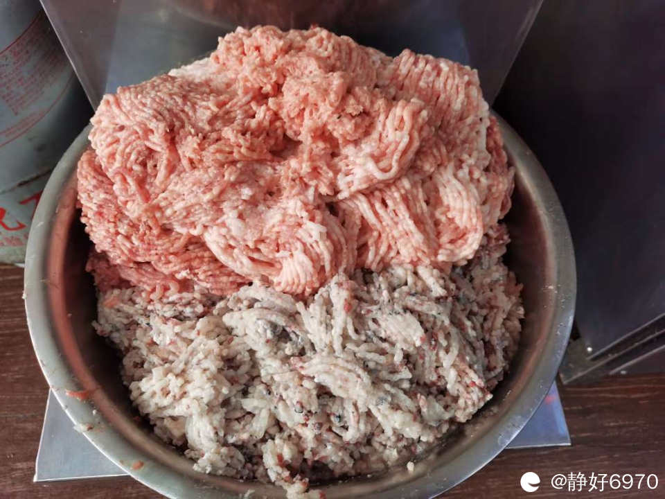 先把猪肉和鱼肉搅碎