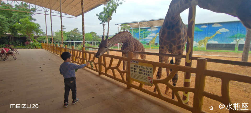 吃完早餐继续逛动物园。先去喂长颈鹿,10块钱一份的树叶,给娃每人喂了4份,这个价钱在广州长隆只能喂一次。