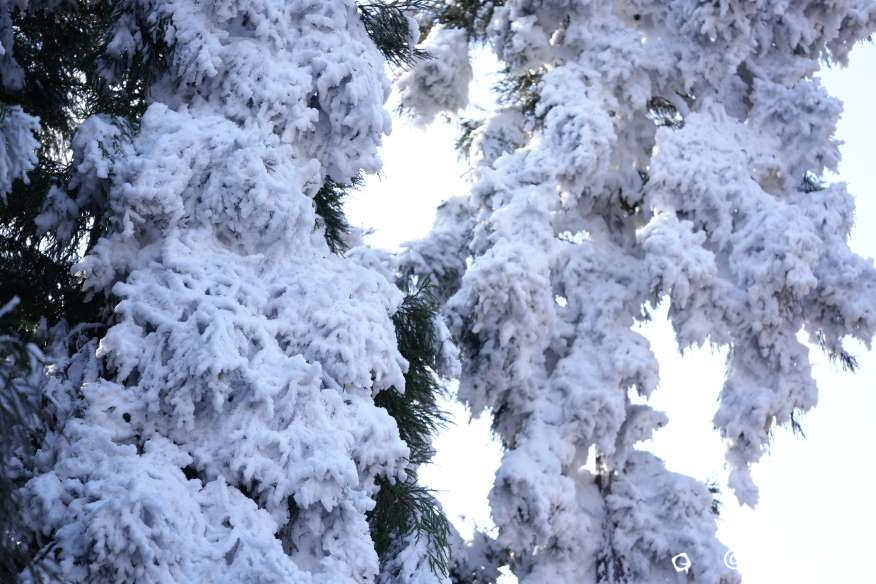 松针凝冰如剑,直指苍穹,每一根针叶都被冰晶包裹得剔透发亮;阔叶枝头挂满茸茸冰穗,仿佛谁在枝头撒下了漫天星子,轻轻一碰便簌簌坠落,碎成满地流光。