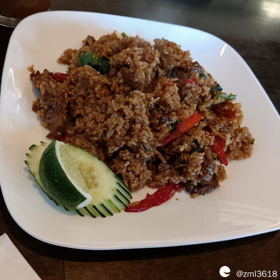 九层塔牛肉炒饭,此炒饭口感有点糯,(是一种短粒米)牛肉很嫩,饭有点油腻,但份量很足。