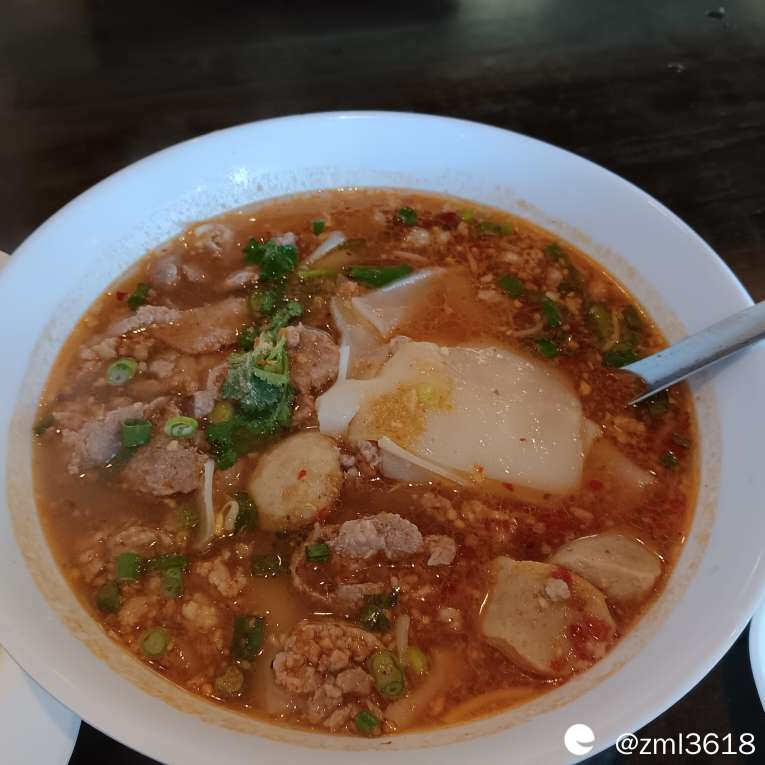 此汤酸辣鲜香,令人胃口大开,里面放了好多虾及肉片,一些粉皮,及搞不懂的香料,连喝两小碗,辣得很过瘾,令人欲罢不能。