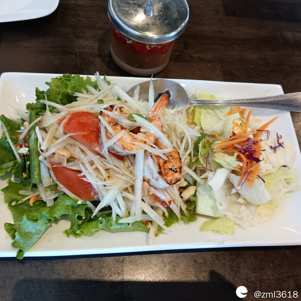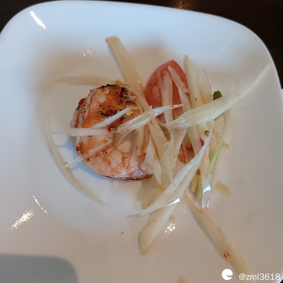 第一道是开胃菜,木瓜沙拉。木瓜丝又脆又酸,微甜微辣,里面放有虾。卖相不错,很清爽,且沙拉汁调制的味道很可口。我挺喜欢这盘木瓜沙拉。
