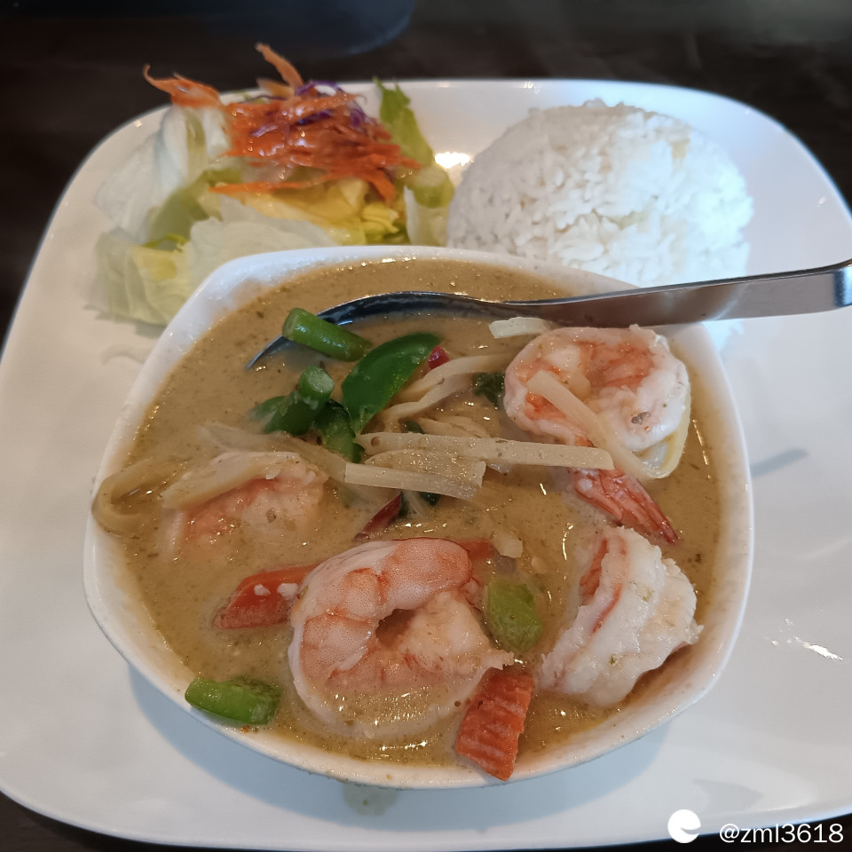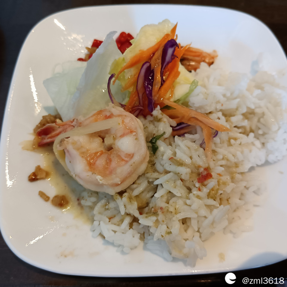 女儿给我点的咖喱虾饭。此咖喱饭与印尼的咖喱饭相似,(我曾去过巴厘岛,雅加达,万隆)这是东南亚的美食。