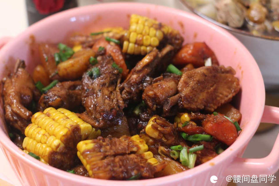 玉米土豆胡萝卜焖龙胜土鸡,一半土鸡用来打汤,一半土鸡用来黄焖,我家的锅不行,感觉有些糊了,糊了好,大吉大利吖,亚比~