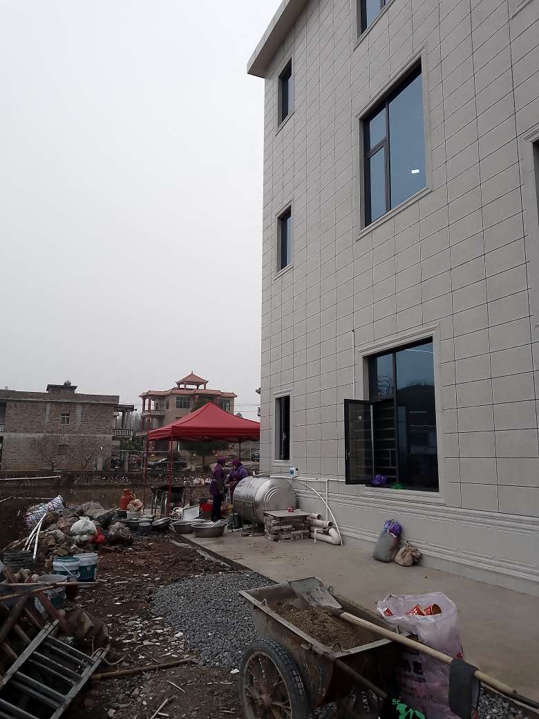 房子的外面一边是马路,后面是果园和菜地,旁边还有个大鱼塘,酒席是在自己家里办的,请的专门办乡村宴席的团队,一切都不用自己操心,全场都是由她们负责……