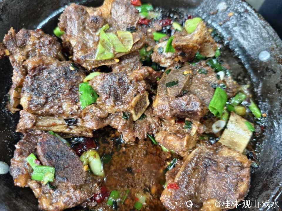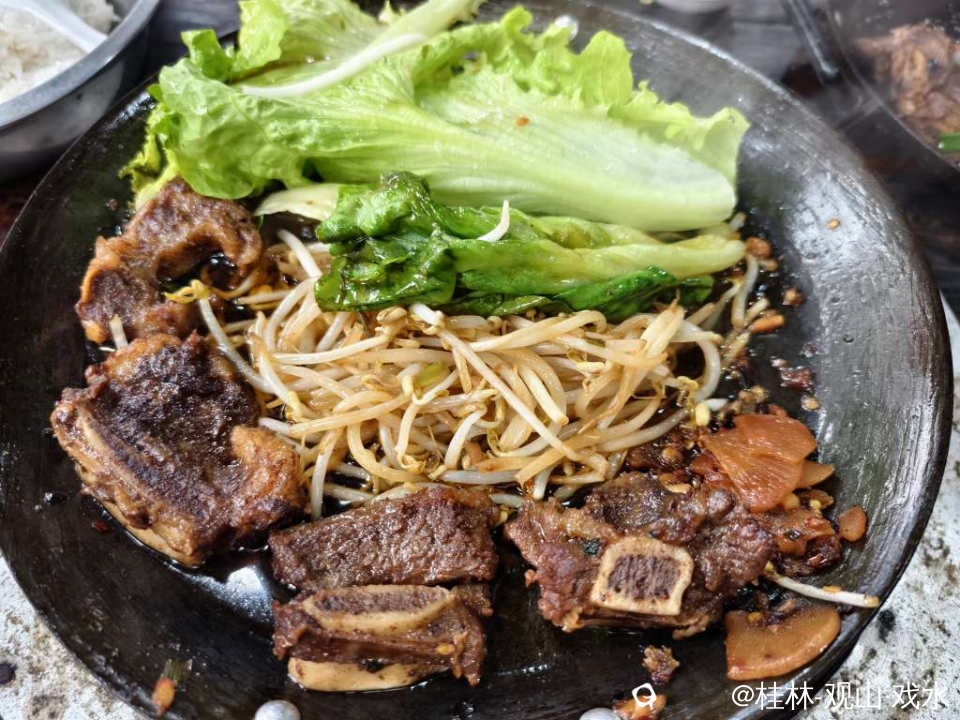 咱家4人,要了一锅蚂,一锅牛排。女婿重庆人,桂林女儿也偏好川味,但对这纯粹桂林味的两个菜,边吃边夸:好吃,好吃,味道不错。邻坐点的香葱煎蛋送上时,葱香蛋香味直冲鼻孔。有一桌一对小俩口,看来是来桂林玩的,4个菜竟全要了。这里每锅蚂、鸡、牛排量挺大的,我们4人两锅尚吃不完(两个老的,肚量小了),他们只两人,可见其不尝遍4菜,绝不甘心的决心。不过,前面有个壮青男,蚂、牛排二锅一个人吃,连豆芽生菜都清的干干净净~年轻人还真挺能吃的。