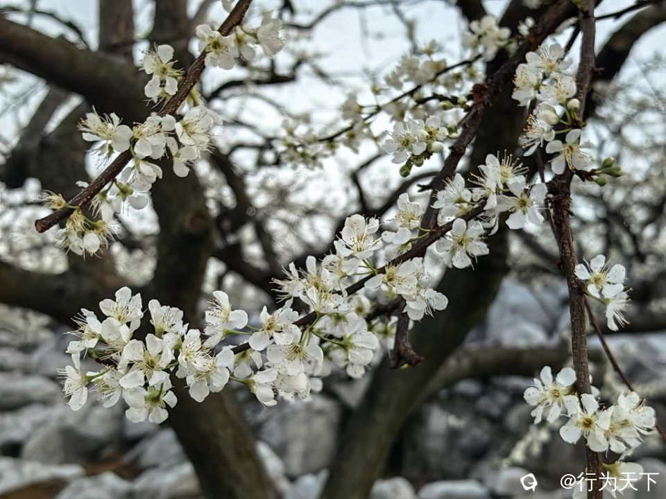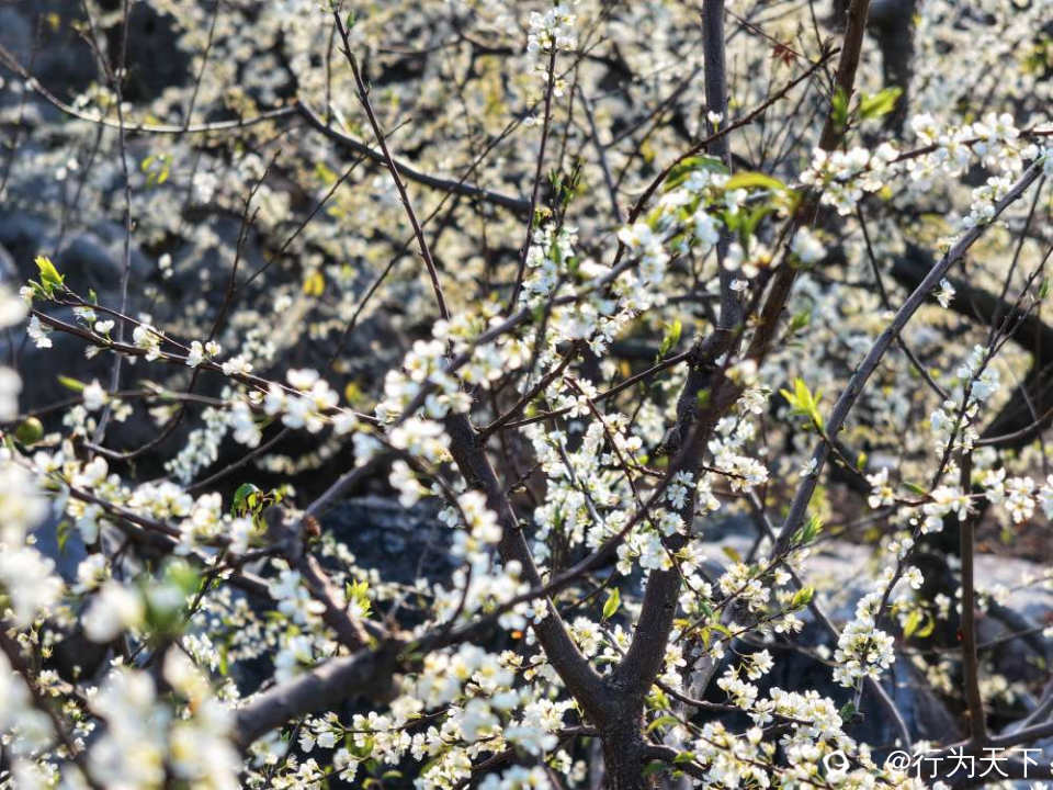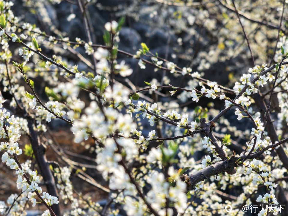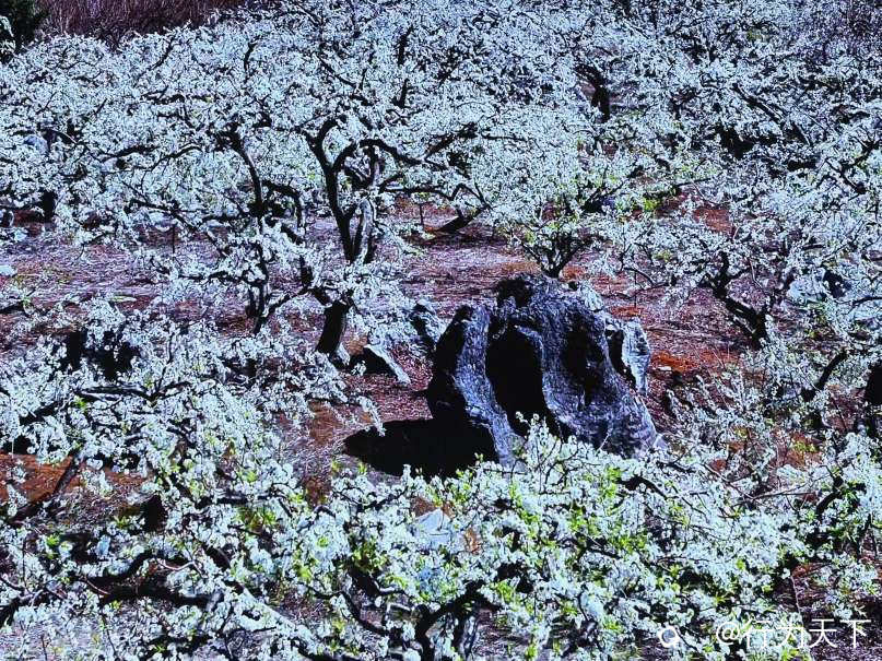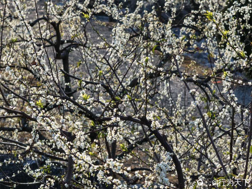 这片花海的壮观,更在于它扎根石漠的坚韧。当年大岭山人“棵树吨石”的耕耘,让千亩石滩变花海,如今每一朵李花都承载着坚韧与希望,在春风中绽放出震撼人心的力量。