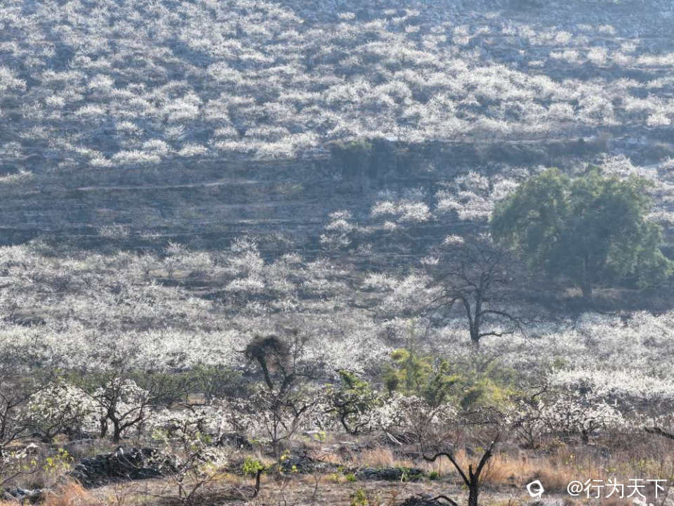 站在山脚抬眼望去,李花如白云垂落人间,顺着山势跌宕起伏,低处如凝脂铺地,高处似雪浪奔涌,连绵数公里无间断。