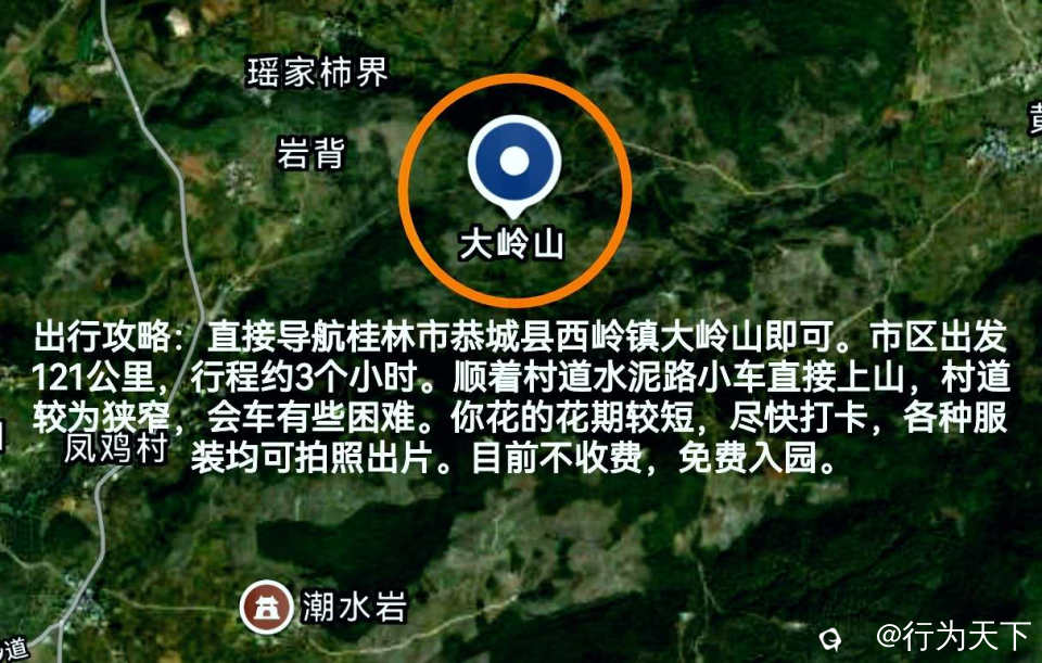 出行攻略:直接导航桂林市恭城县西岭镇大岭山即可。市区出发121公里,行程约3个小时。顺着村道水泥路小车直接上山,村道较为狭窄,会车有些困难。