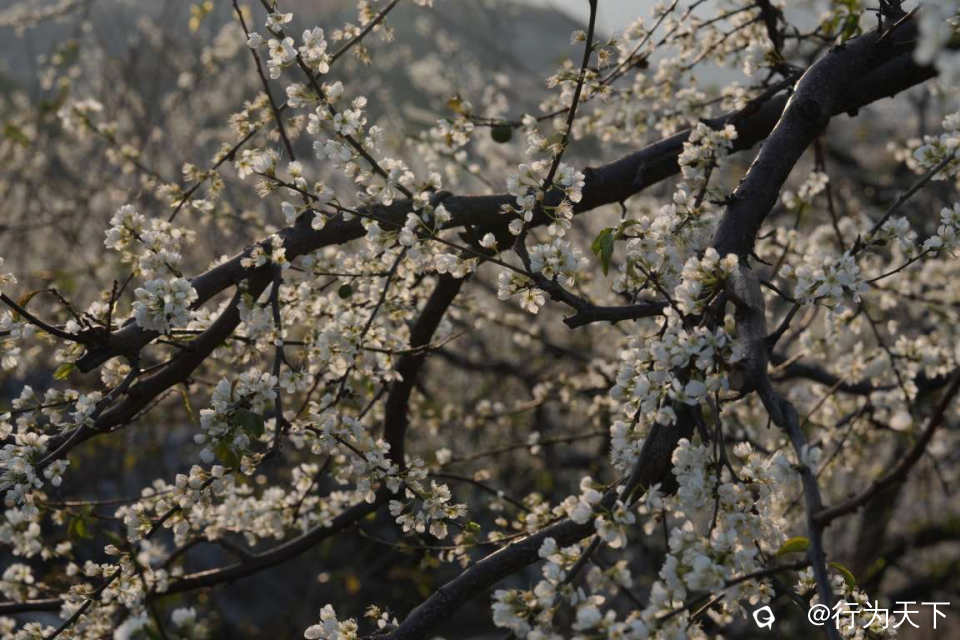 千枝万蕊挤簇成云,每一根枝条都被繁花压弯,不见一片杂叶,唯有纯白花瓣层层叠叠,密不透风地覆盖了山野沟壑,仿佛大自然用白玉重塑了整座山岭。