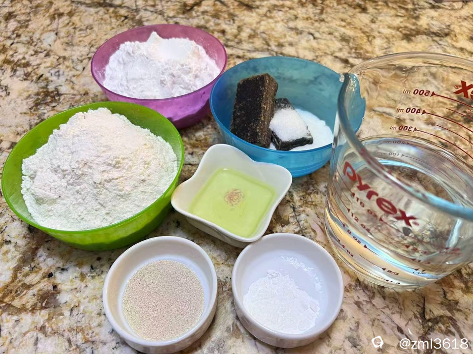 配料有:面粉;木薯粉;黄糖;油;酵母等等。