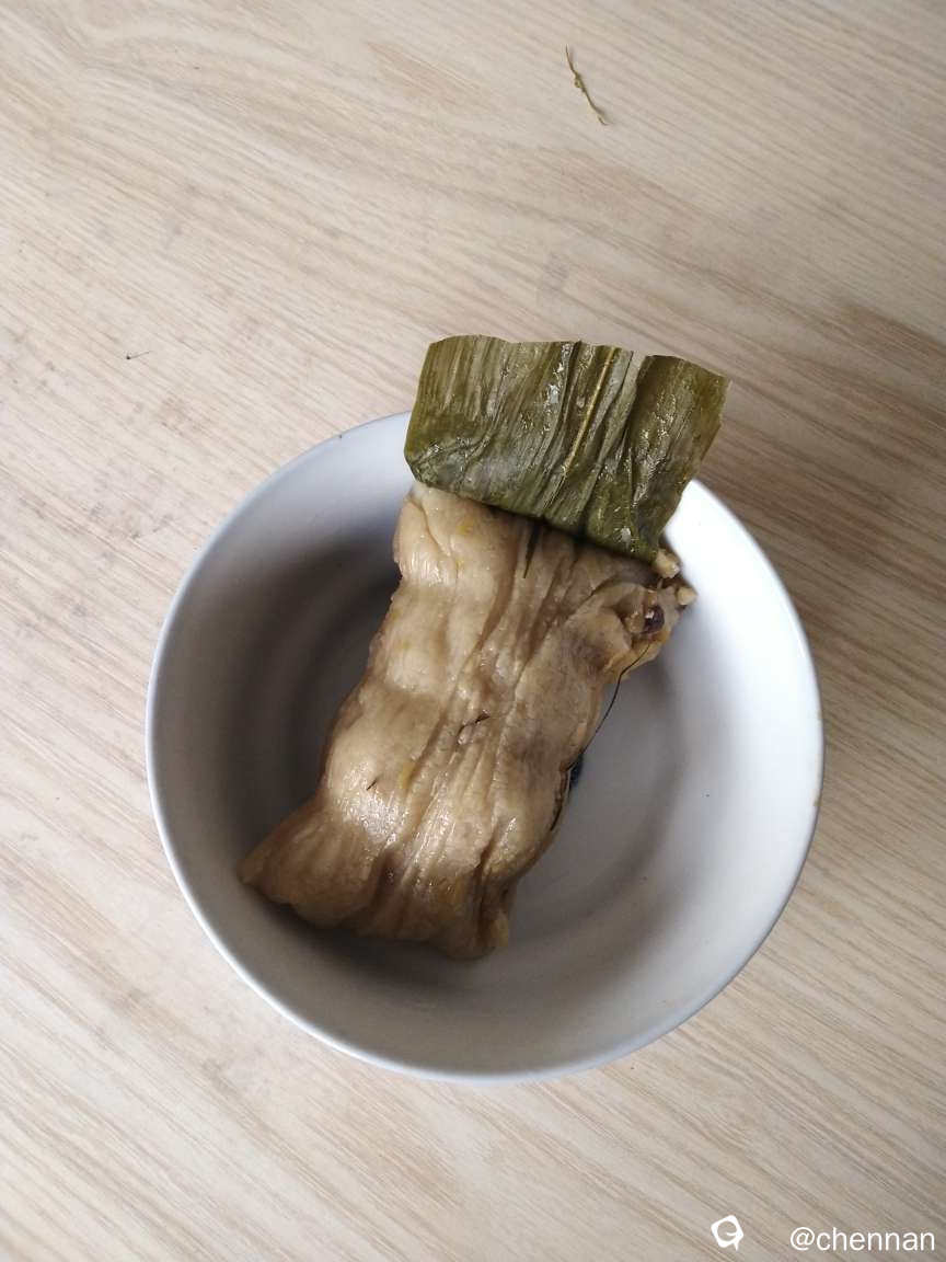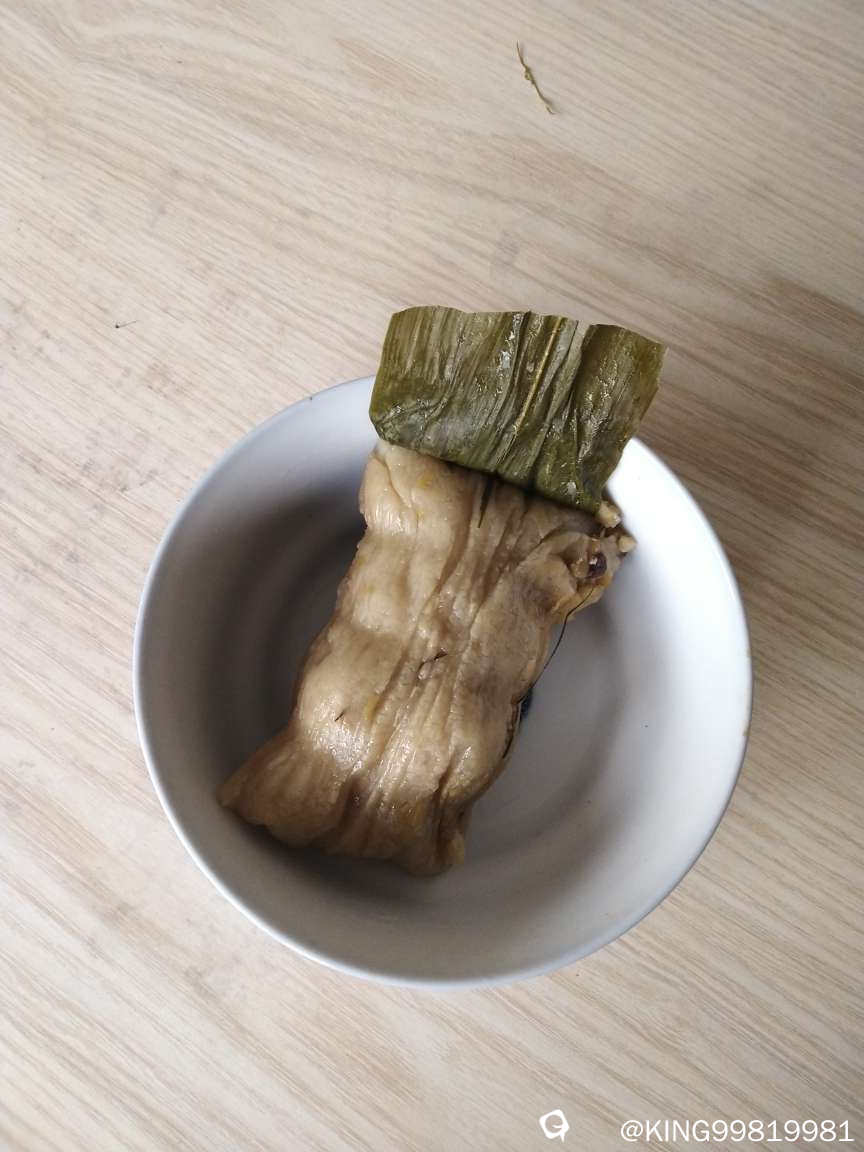 今天早上第一次打开一个粽子,准备蒸来吃早点,我已经有两三年没买粽子大王的粽子了,剥开粽叶以后,总感觉这粽子比以前小了,这糯米没涨价,肉价更是跌了,莫讲这粽叶涨价了?