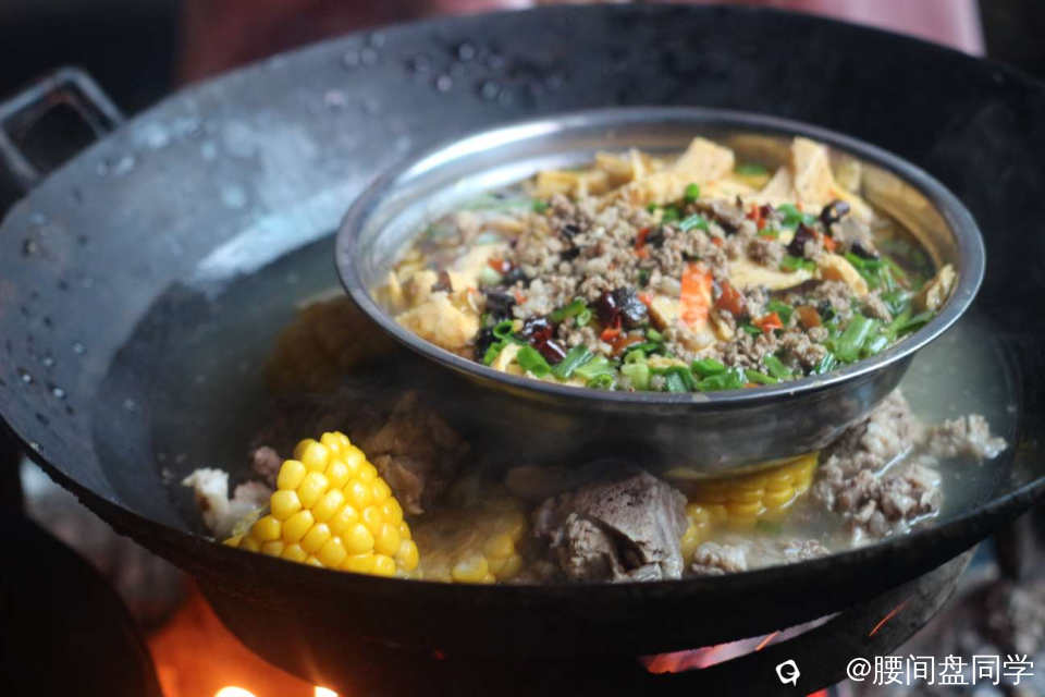 我抱着儿子找了个座位入坐,上菜了!第一道:排骨玉米打汤,肉沫豆腐,寓意全寨子都富裕,顺风顺水一切都顺!