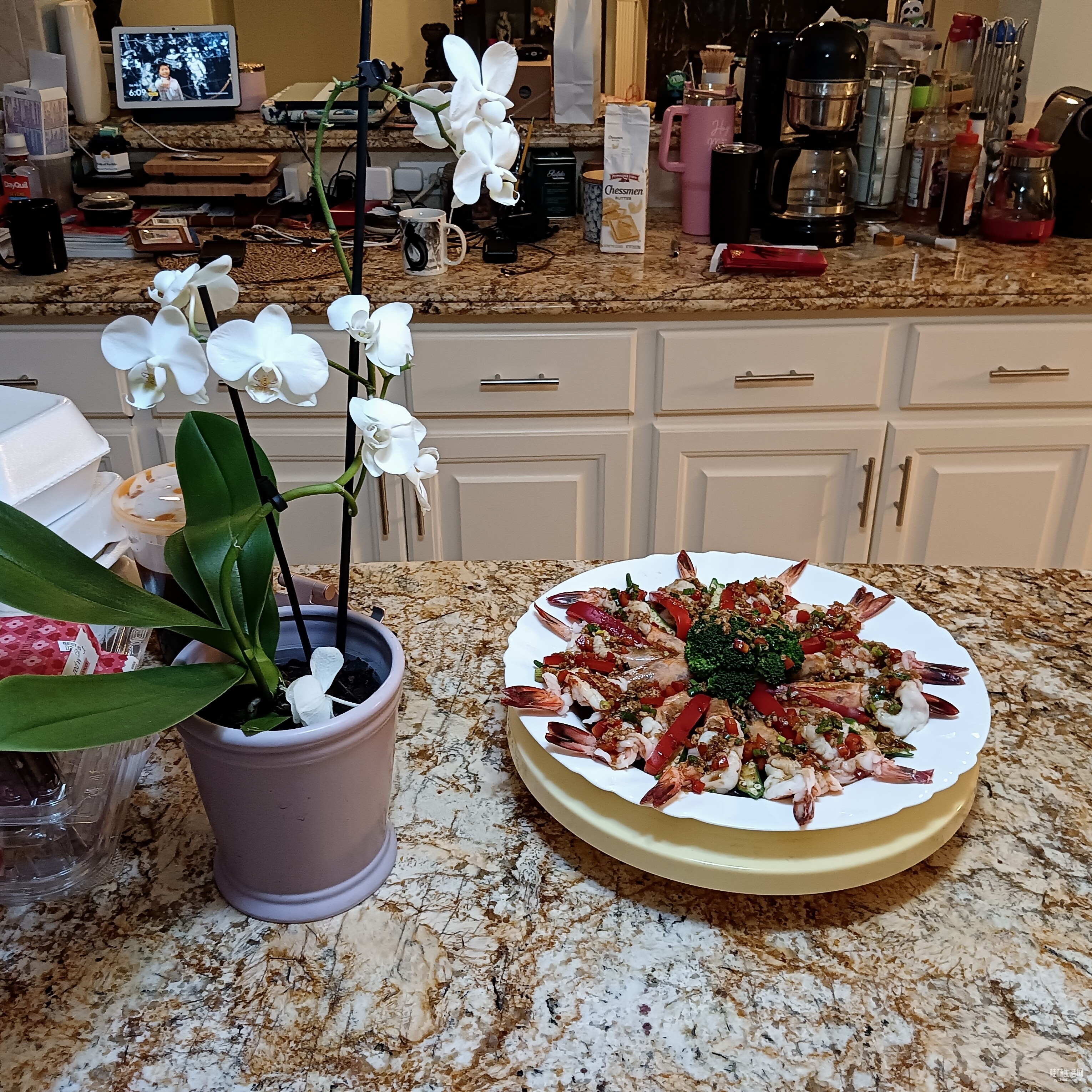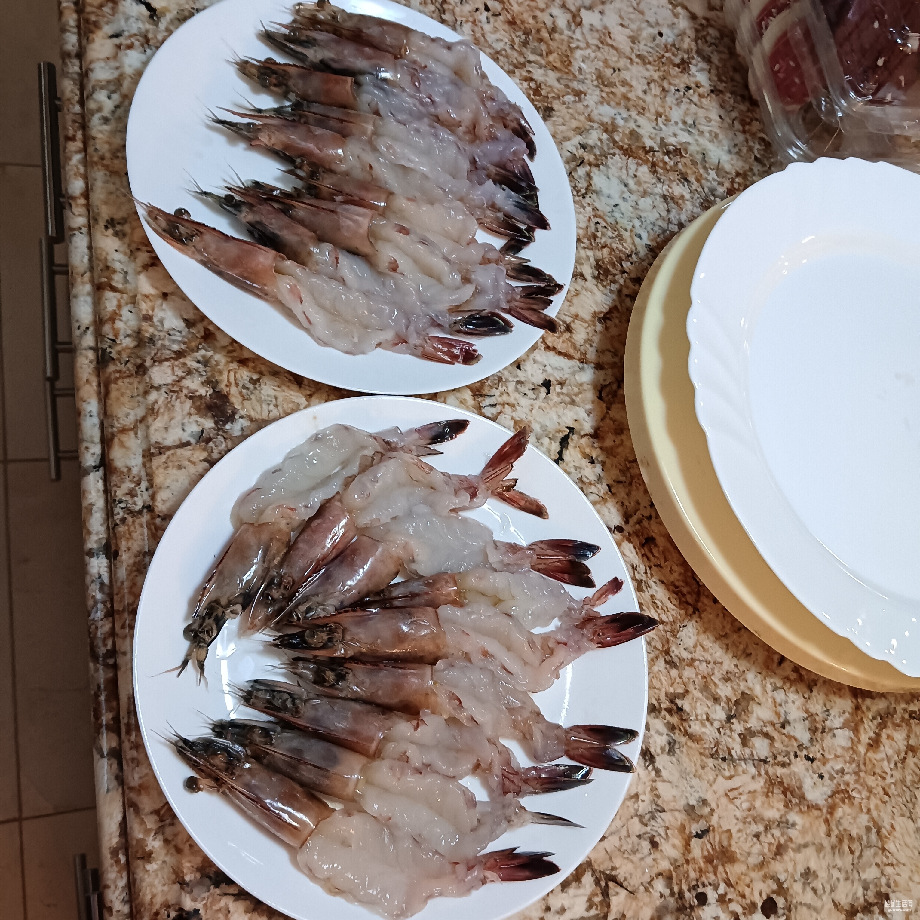 我家准备的聚餐菜肴是:花开富贵虾,马到成功蛋糕,女儿好用心呢,头天备料,准备做蛋糕的材料,今天下午准备大虾这道主菜,大虾开背,摆盘,调料汁,累了一个下午。