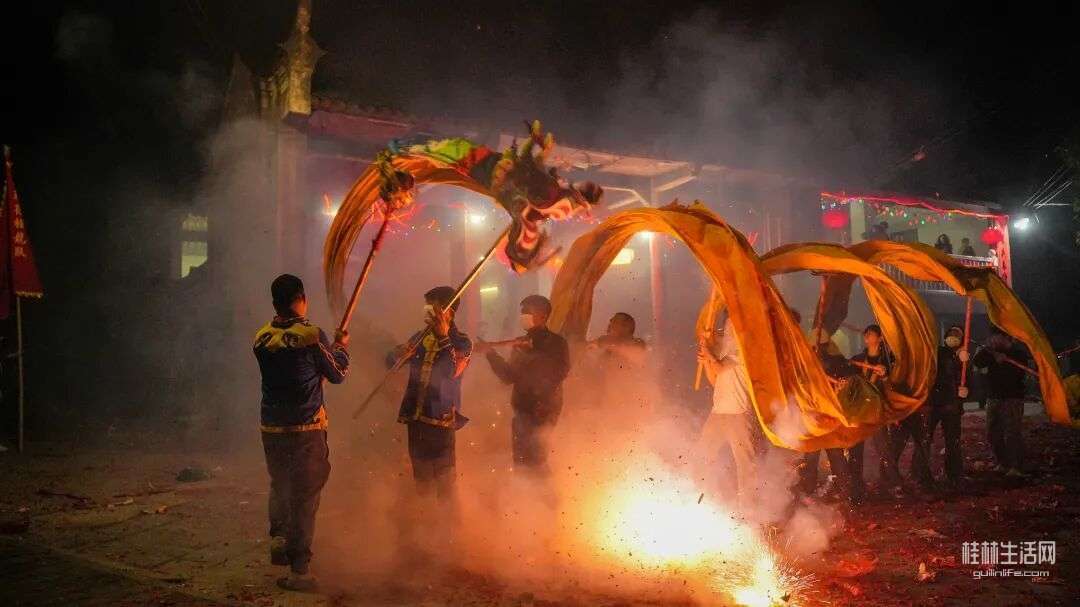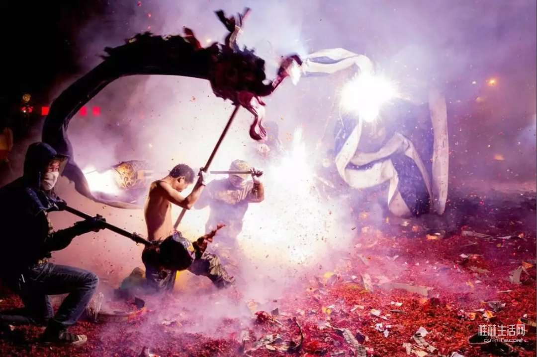 富川炸龙节,它被央视感叹为“勇敢者的游戏”,也被称为瑶乡的狂欢节!始于明万历年间,已经有四百多年的历史。每年正月初十至十五,人们“吃灯酒”、赏花灯、调龙炸龙,是富川一年中最热闹的民俗祈福活动,已被列为第五批广西非物质文化遗产名录。每年正月初九前人们清扫、装饰和布置灯楼。初九晚上或初十上午,灯楼所辖街巷凡是上一年有孩子出生的人家(俗称“灯头”),会携带祭品到灯楼上灯,为孩子祈福。上灯期间,灯头会连续几天宴请好友和整条街道的男女老少。正月初十,古明城更是车水马龙,家家户户都是前来惯节的亲友。