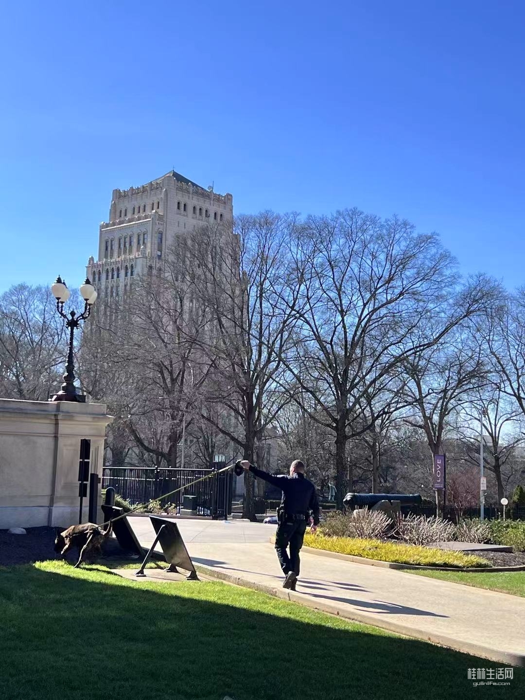 警察带着警犬在州政府大院里巡视。