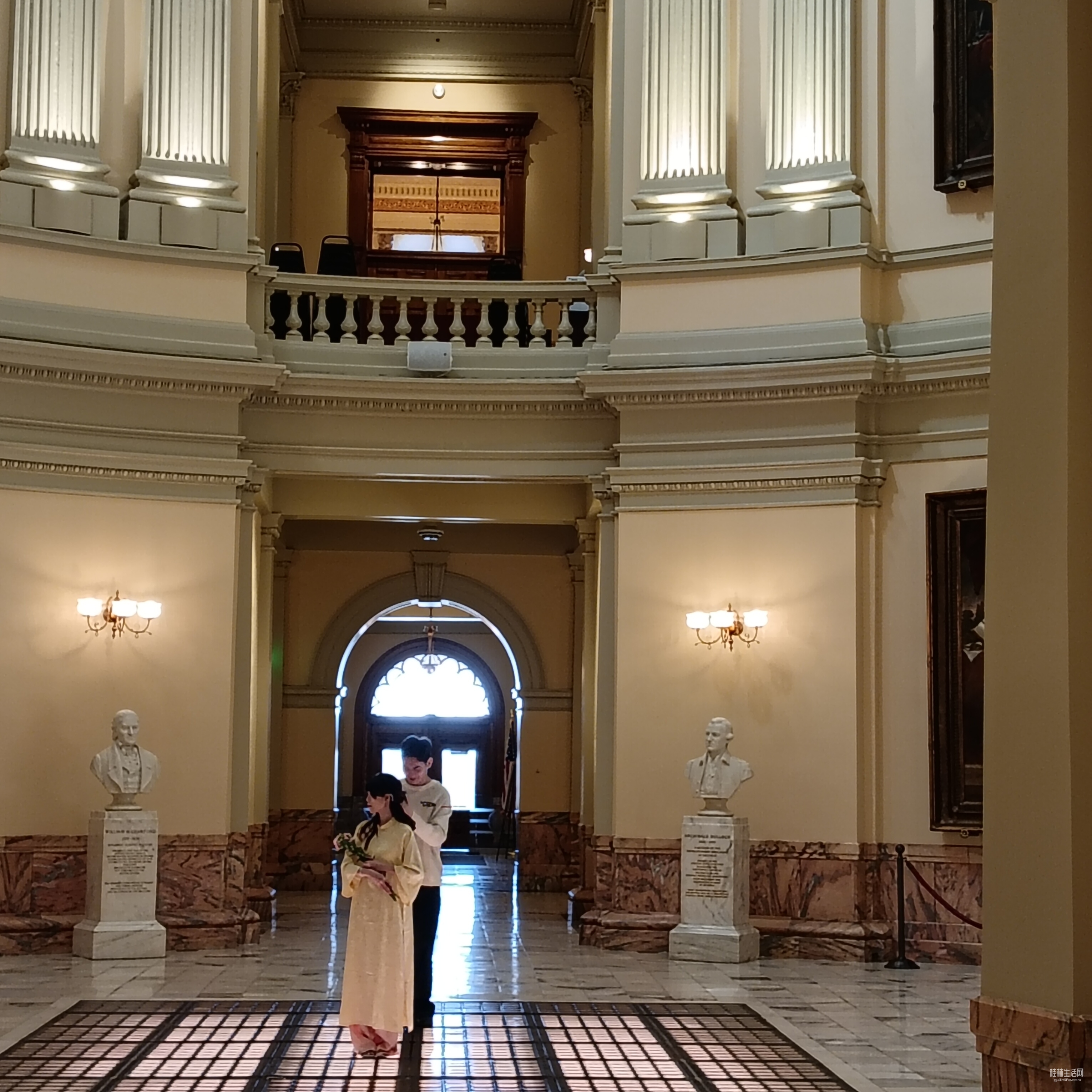 偶遇两个来大厦里写真的越南情侣,女孩穿着奥黛,手捧鲜花。在州政府大厦里自拍。