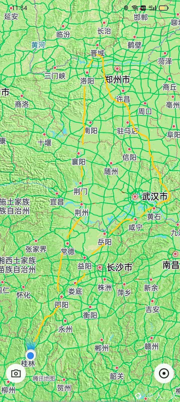 下图黄线:桂林-邵阳-益阳-岳阳-咸宁-黄石-信阳-驻马店-许昌-晋城-洛阳-南阳-襄阳-荆门-荆州-常德-邵阳-桂林。