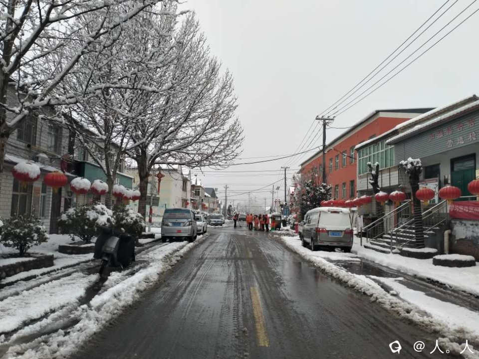 第二天一早冰雪融化,有工人在路上铲雪。