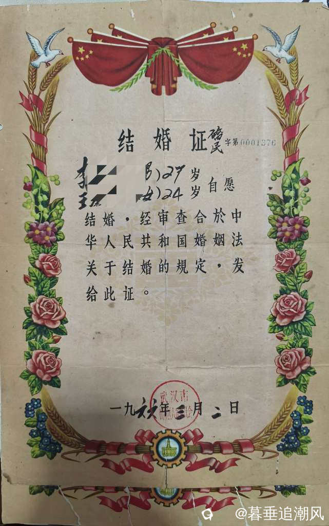 今天是我与老伴的结婚纪念日,一晃60年过去了。翻开这张泛黄的结婚证,红绸与麦穗的花纹里,藏着我们那个年代最朴素的誓言。没有钻戒,没有彩礼,只有会议室里四对新人并肩而立的身影;没有豪宅,没有豪车,只是两张单人床一拼,一张借来的两斗桌,便是我们全部的家当。 那时的爱情,像一杯清酒,简单却醇厚。我们用月工资的5%买喜糖,甜的是心意,不是排场;我们住单位分配的宿舍,暖的是陪伴,不是面积。我们不谈“条件”,只讲“同心”;不算计得失,只相信“往后余生,风雨同舟”。 再看如今,婚恋竟成了一场精密的交易:房车存款成了入场券,彩礼嫁妆成了筹码,连感情都要在天平上反复称量。人们用物质筑起高墙,用算计包裹真心,却忘了婚姻的本质,本是两个灵魂的相互依偎,而非一场资源的等价交换。 我们那代人,不是不懂物质的重要,而是更明白:真正的家,不是钢筋水泥的房子,而是那个愿意和你一起把日子过暖的人;真正的幸福,不是琳琅满目的奢侈品,而是那份“你信我,我靠你”的踏实。 愿这张老结婚证,能像一面镜子,照见我们曾经的纯粹,也警醒当下的浮躁:别让错位的欲望,弄丢了爱情本来的模样。