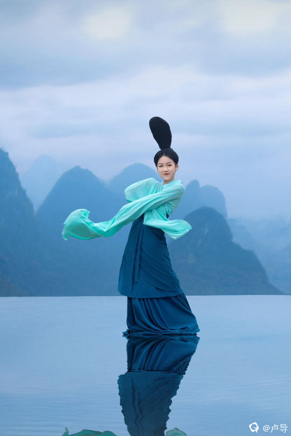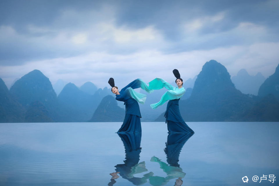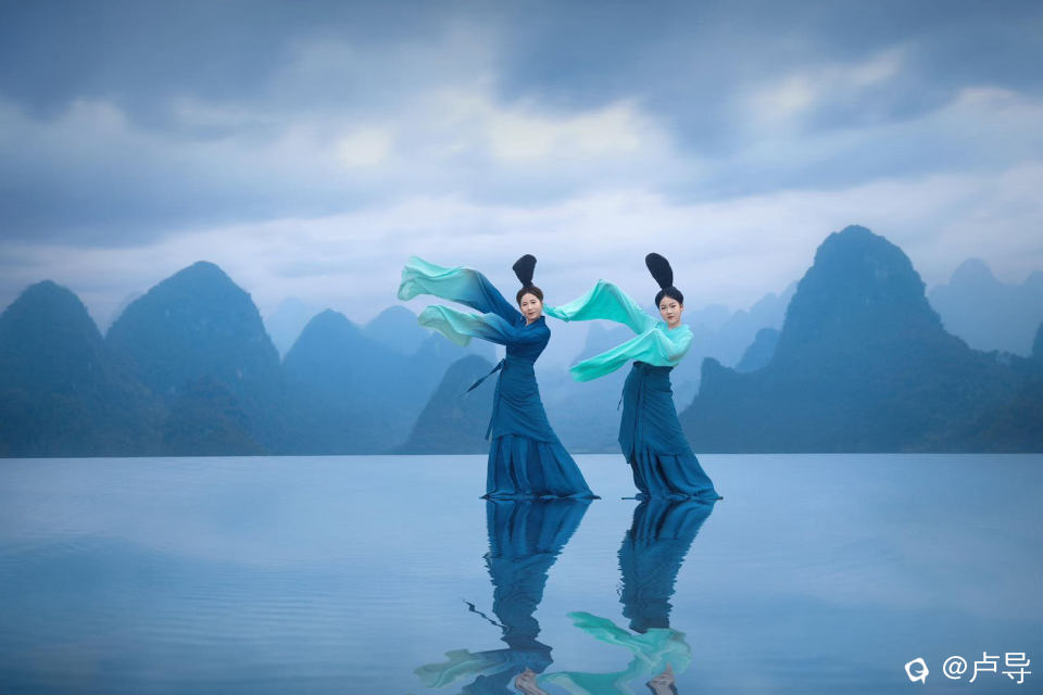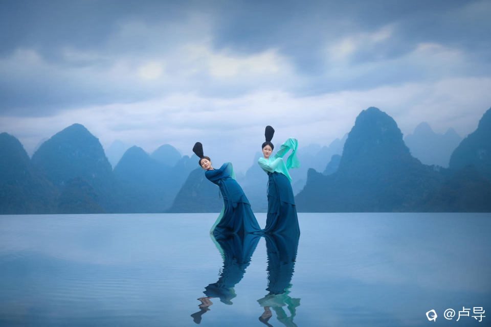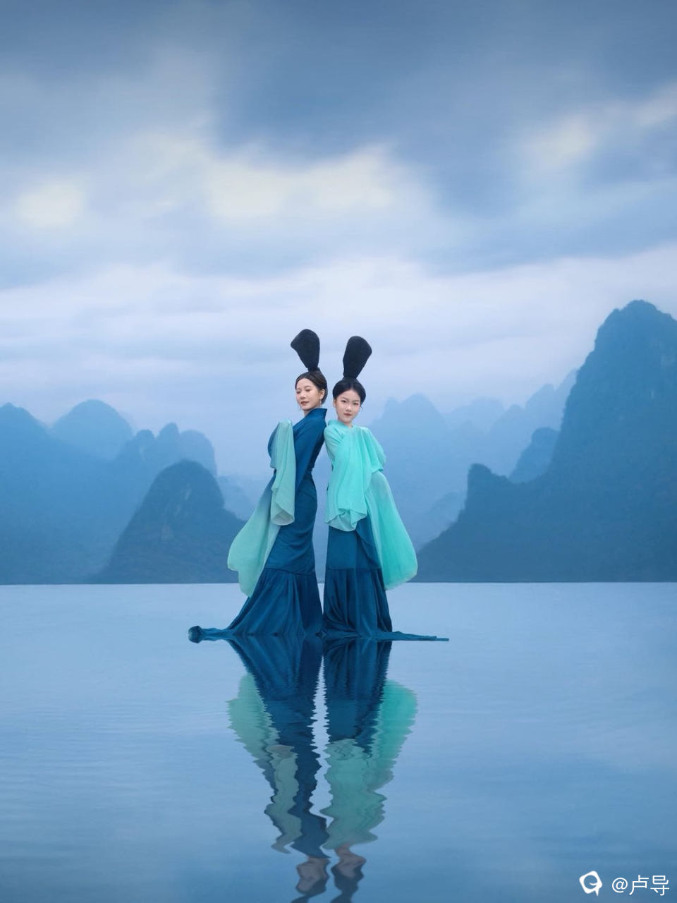 一立一倚间,是江南的温婉与桂林的灵秀碰撞;镜水映出的倒影,让每一帧都像从《千里江山图》里走出来的画面。