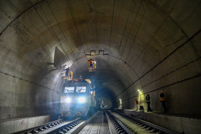 武斌告诉记者:“为防止隧道内松动的混凝土块被动车运行时的强大气流抽吸导致掉落,我们通过轨道车升降平台对隧道墙面进行检查,清理松动部位,确保列车运行安全。”