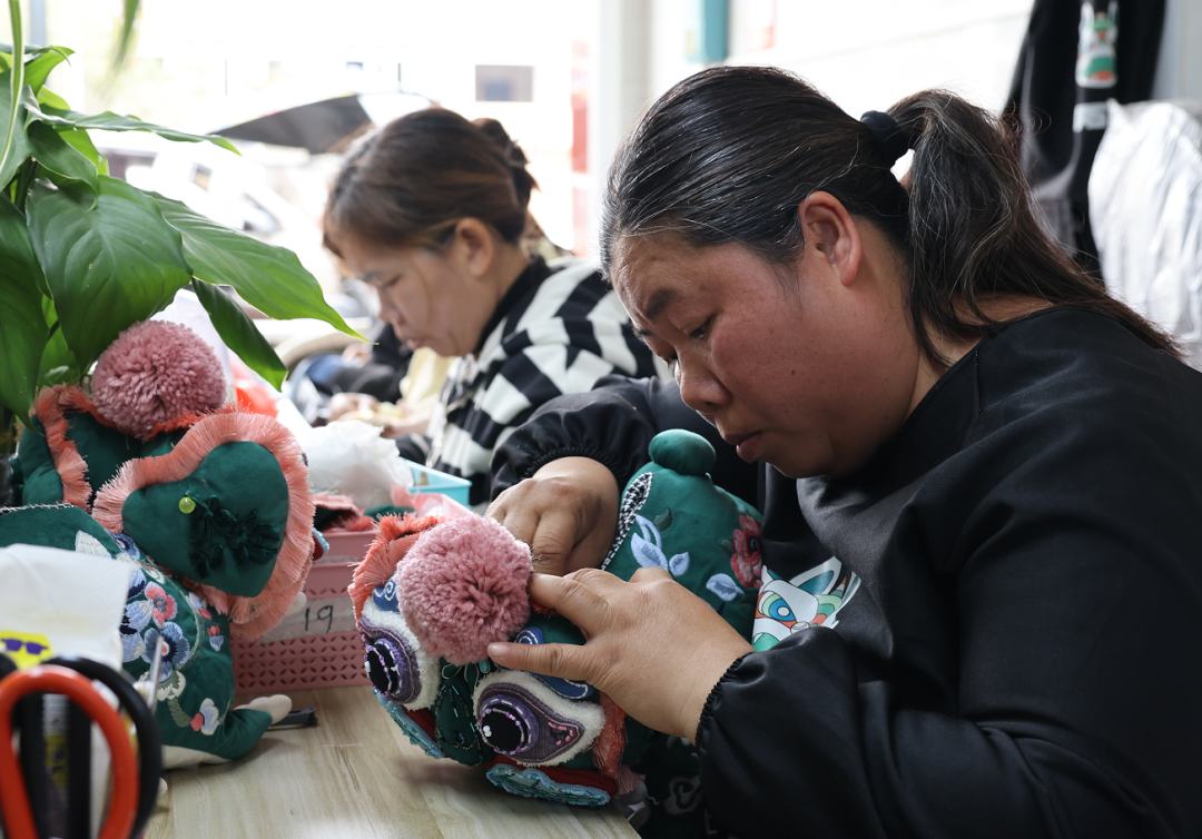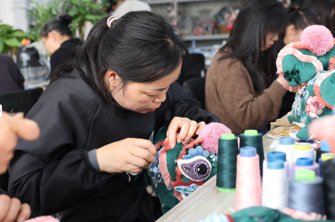 汪冬梅喜欢的手绣作品全都来自桂林平乐县同安镇芽小七绣房。每天,30余名绣娘都会在这里穿针引线,用精致的手绣做出了各类工艺品。龙头图案的手袋、纯手工的虎头帽以及背包等一件件作品,将传统刺绣与国潮元素巧妙融合,大受市场欢迎。