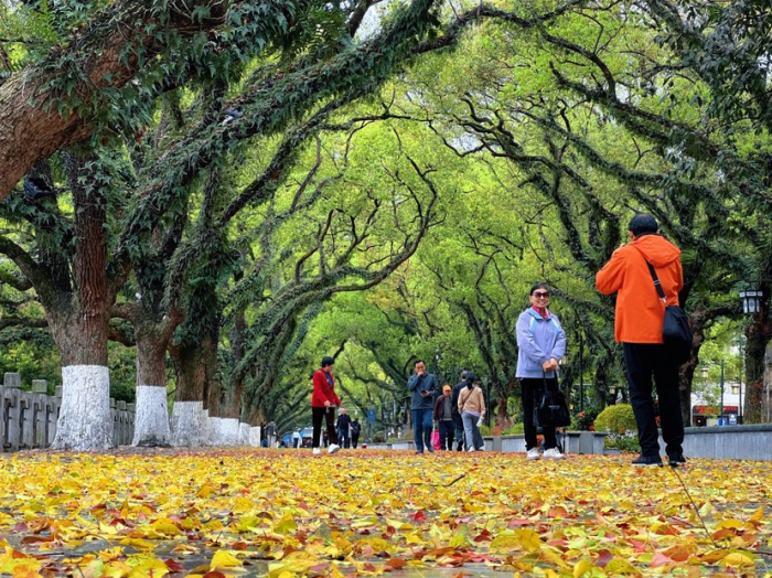 桂林作为山水旅游名城,自然景观与人文底蕴相辅相成,春季落叶是南方特有的自然现象,也是城市生态之美的重要组成部分。制造这场落叶美景的主角之一是桂林的乡土树种香樟树,在市区滨江路、漓江路、环城北一路、七星路、中山南路、西山路、凤北路等路段都能见到。其中,王城景区里的香樟树有80多株,是上世纪60年代种的;而沿着漓江蜿蜒的滨江路上种植的香樟树,则是上世纪60年代和70年代所种,共有408株。如今已实行“落叶缓扫”的王城景区,就成为市民游客欣赏落叶美景的好去处。