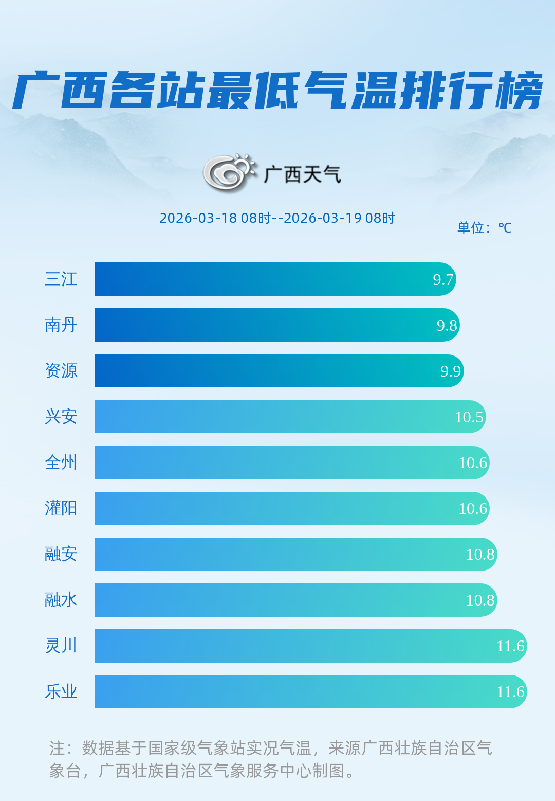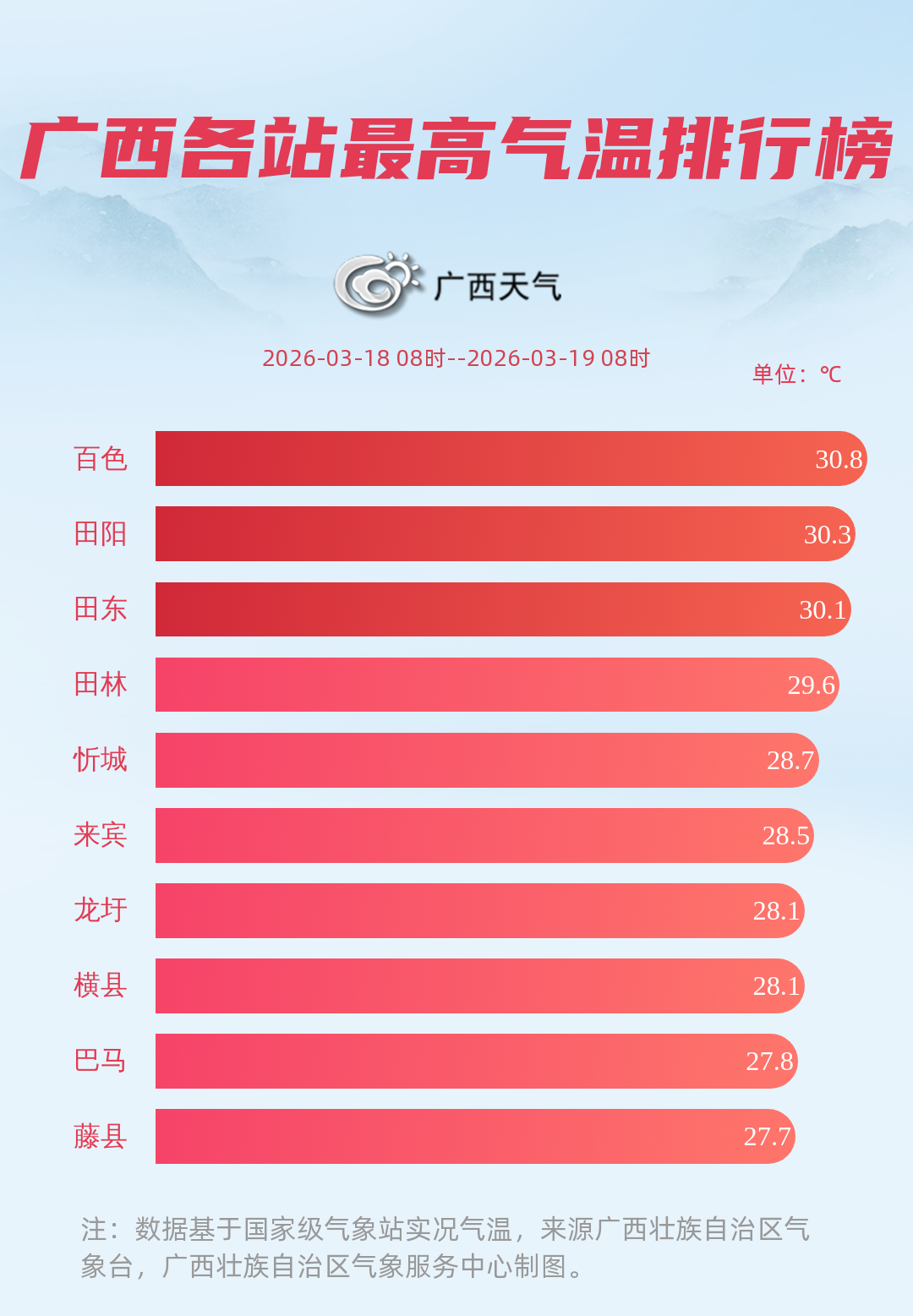 昨天(3月18日)08时至今天(3月19日)08时,桂北出现了一些小雨,局地中雨,桂林灌阳县新街镇雨量最大,下了14.2毫米(中雨);最高气温:桂北部分地区不到20℃,其余大部23~28℃,局地29~30℃,百色市气温最高,达到了30.8℃;最低气温:桂北个别地方只有个位数,其余大部1字开头,柳州三江侗族自治县气温最低,仅9.7℃。