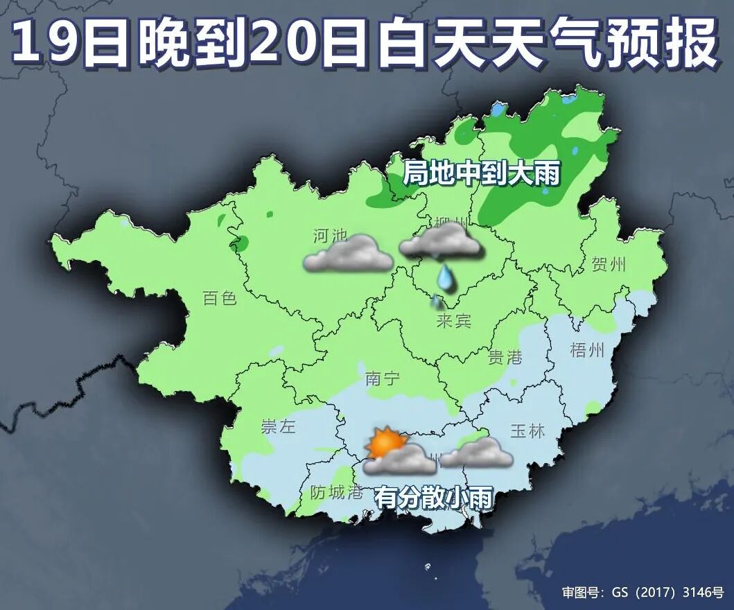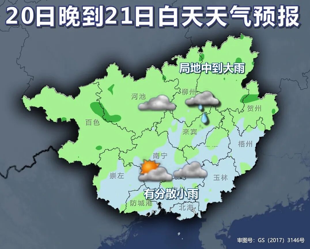 20日晚上到22日白天,桂北阴天有小雨、局地中到大雨,桂南多云到阴天有分散小雨。
