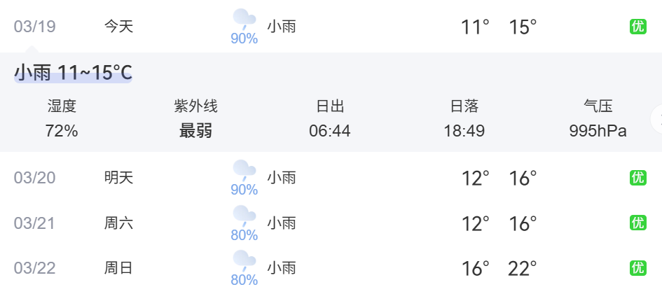 20日:阴天有小雨,局部中雨,气温11℃~15℃;