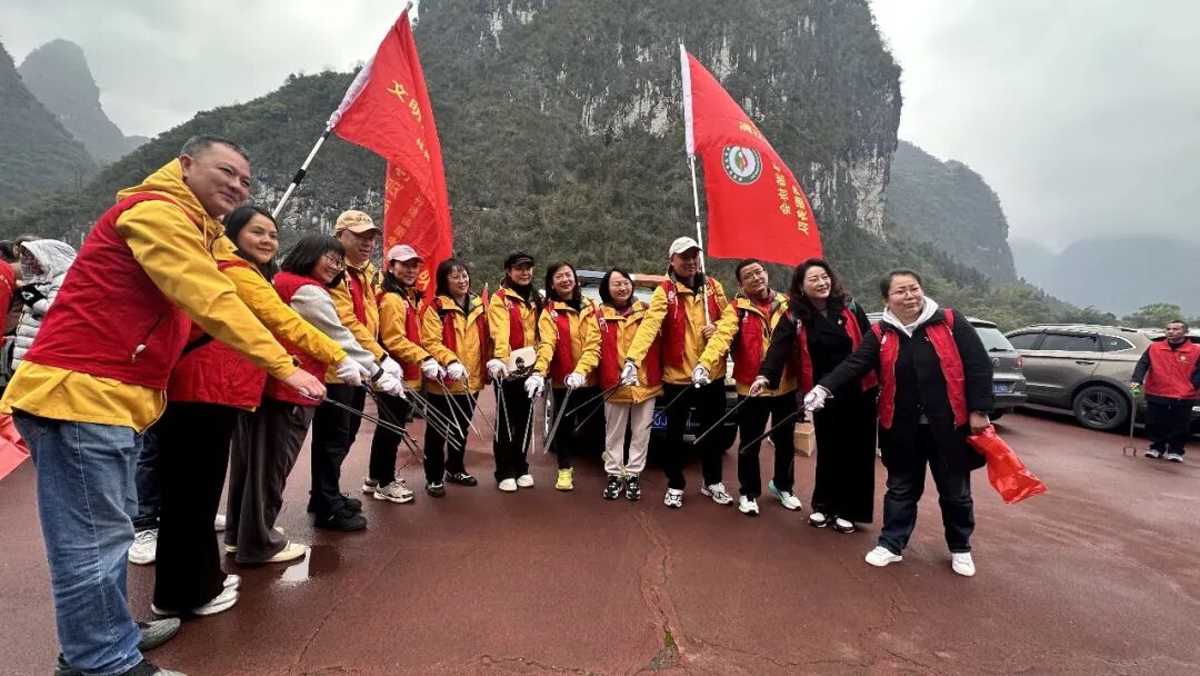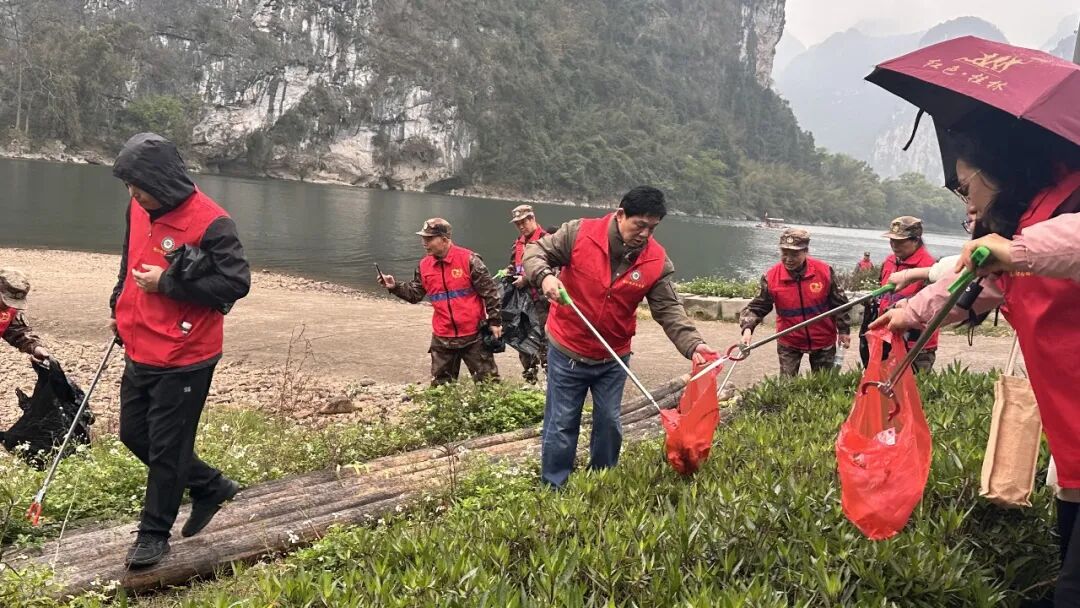 紧接着,志愿者们兵分多路,开展法规宣传与净滩行动。到漓江两岸,清理捡拾废弃物,清洁沿岸标志标牌,让岸边、步道更加干净整洁。红马甲的身影在漓江边格外醒目,成为春日里一道温暖的风景线。