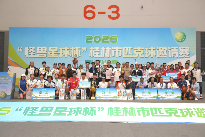 3月28日至29日,桂林自主创办的匹克球赛事——2026年“怪兽星球杯”桂林匹克球邀请赛在桂林国际会展中心成功举办。来自全国各地的48支队伍共300多人在桂林一决高下、争夺桂冠。经过两天激烈角逐,东莞曼丁斯队 、象州硕帕克队、怪兽星球老顽匹二队分别获得常青组团体赛冠、亚、季军。嘻嘻哈哈队、伍桂山水星火队、桂林市漓江匹克球俱乐部分别获得公开组团体赛冠、亚、季军。
