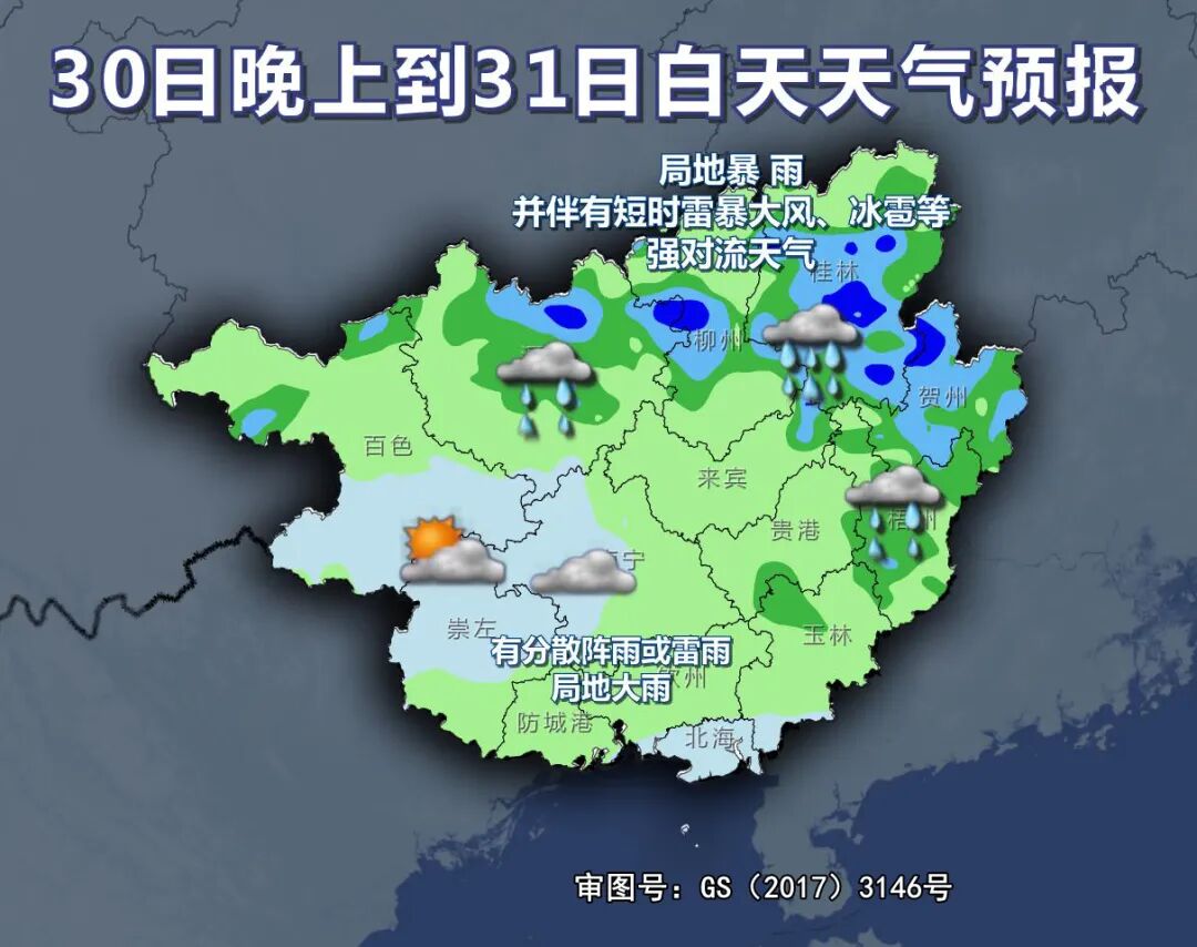 根据最新气象资料分析,预计今天(3月30日)白天到31日白天,桂林各地有一次中雨、局部大雨到暴雨过程,并伴有短时雷暴大风、冰雹等强对流天气。过程累计雨量20-40毫米、局部60毫米以上,最大小时雨量20-30毫米。