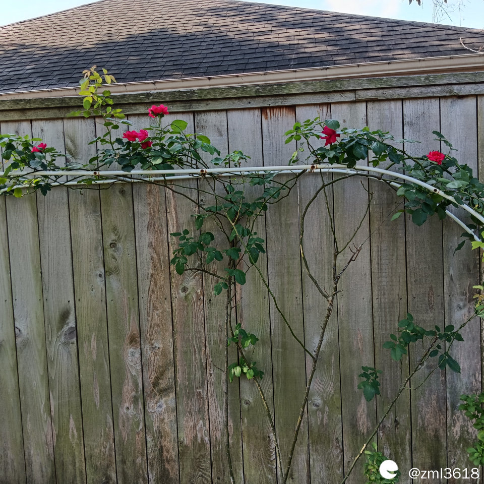 我家后院的攀藤玫瑰,红艳艳的,初绽笑脸,很是娇媚。