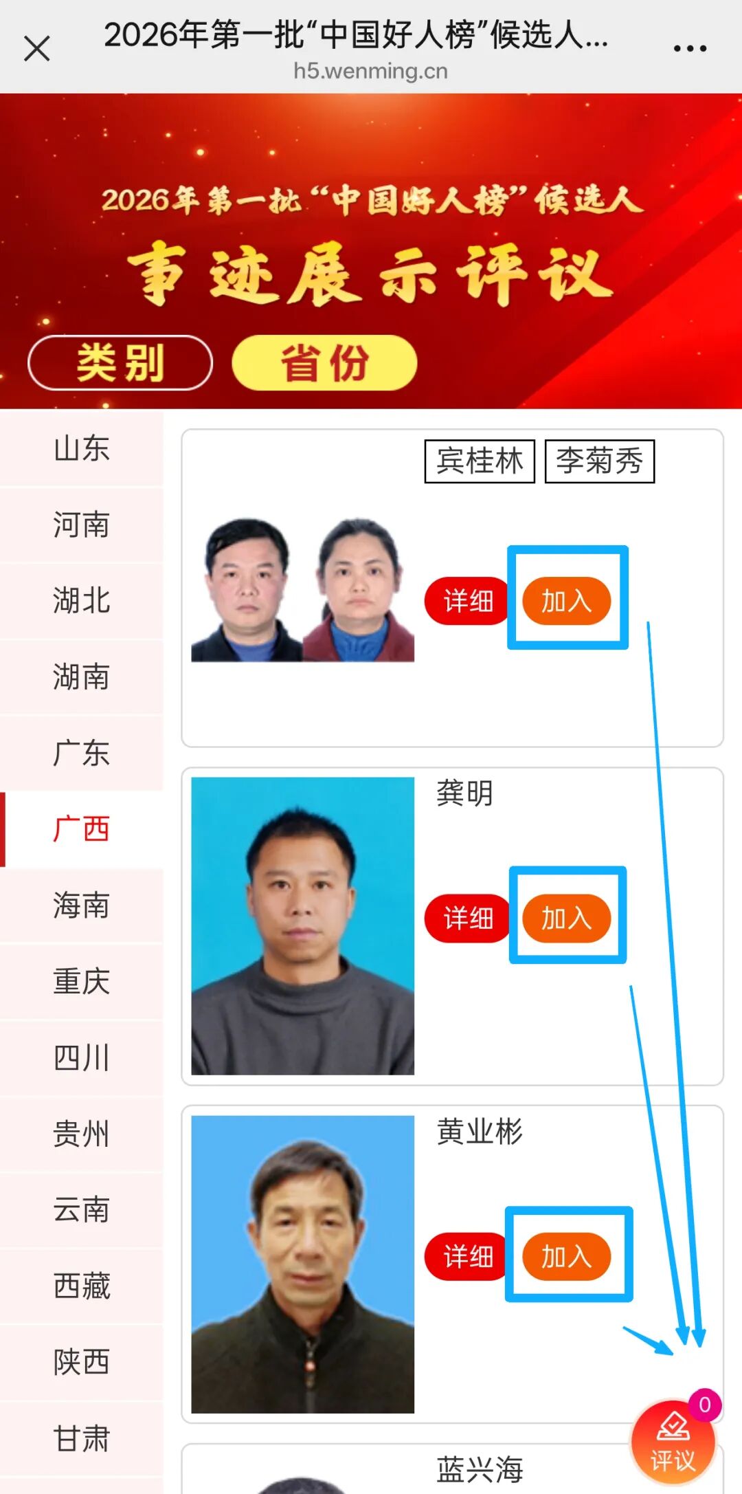 点击“省份”,下滑选择“广西”点击人物“详细”即可浏览好人事迹,点击右下角“评议”键,确定您要评议的对象,点击“向他们学习”即为评议成功。值得注意的是,一次可评议多位候选人。