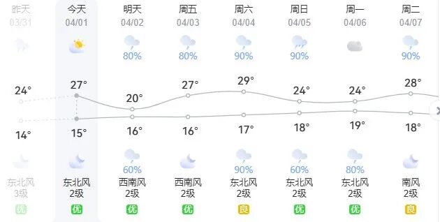 4月1日晚上到4月2日白天,桂东北多云到阴天有阵雨或雷雨、局地中雨,其它地区多云到晴。桂西、桂南部分地区午后有5级、阵风6~7级的偏南风。