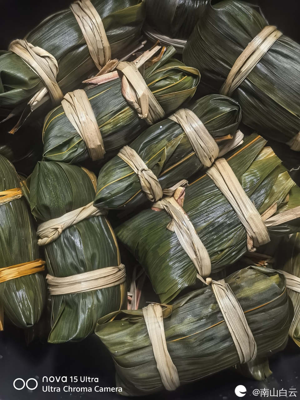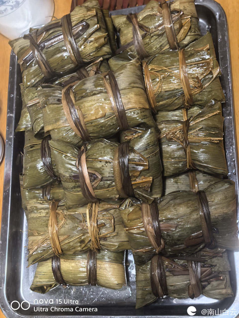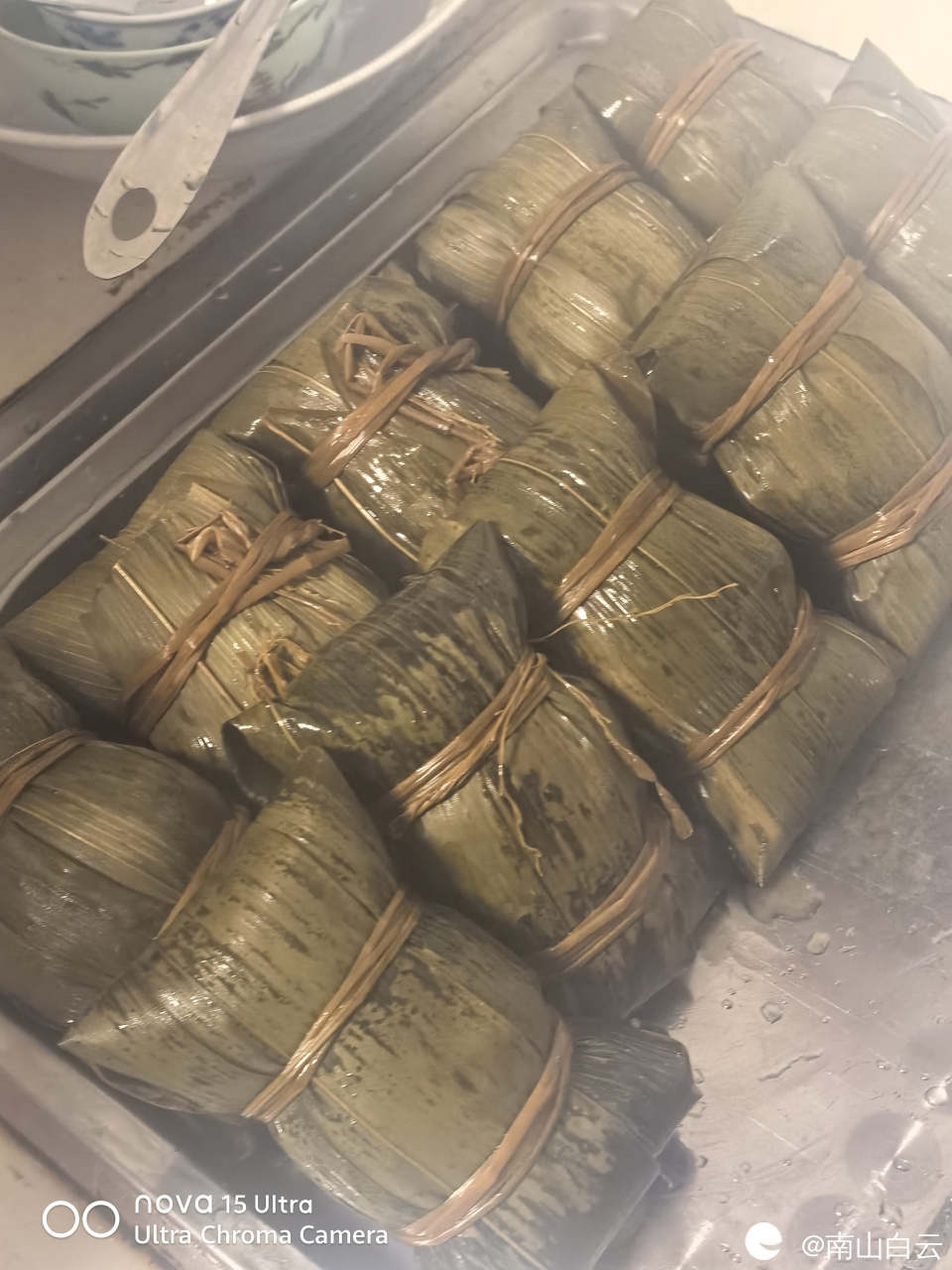 高压锅里烹饪的功能是蹄筋菜单,时间稍微慢点。最后,烹饪结束,粽子出锅。糯米与五花肉,板栗在竹叶的环境里散发魅力,正如宋大文豪苏轼的名句 棕叶香飘十里,对酒携樽俎。