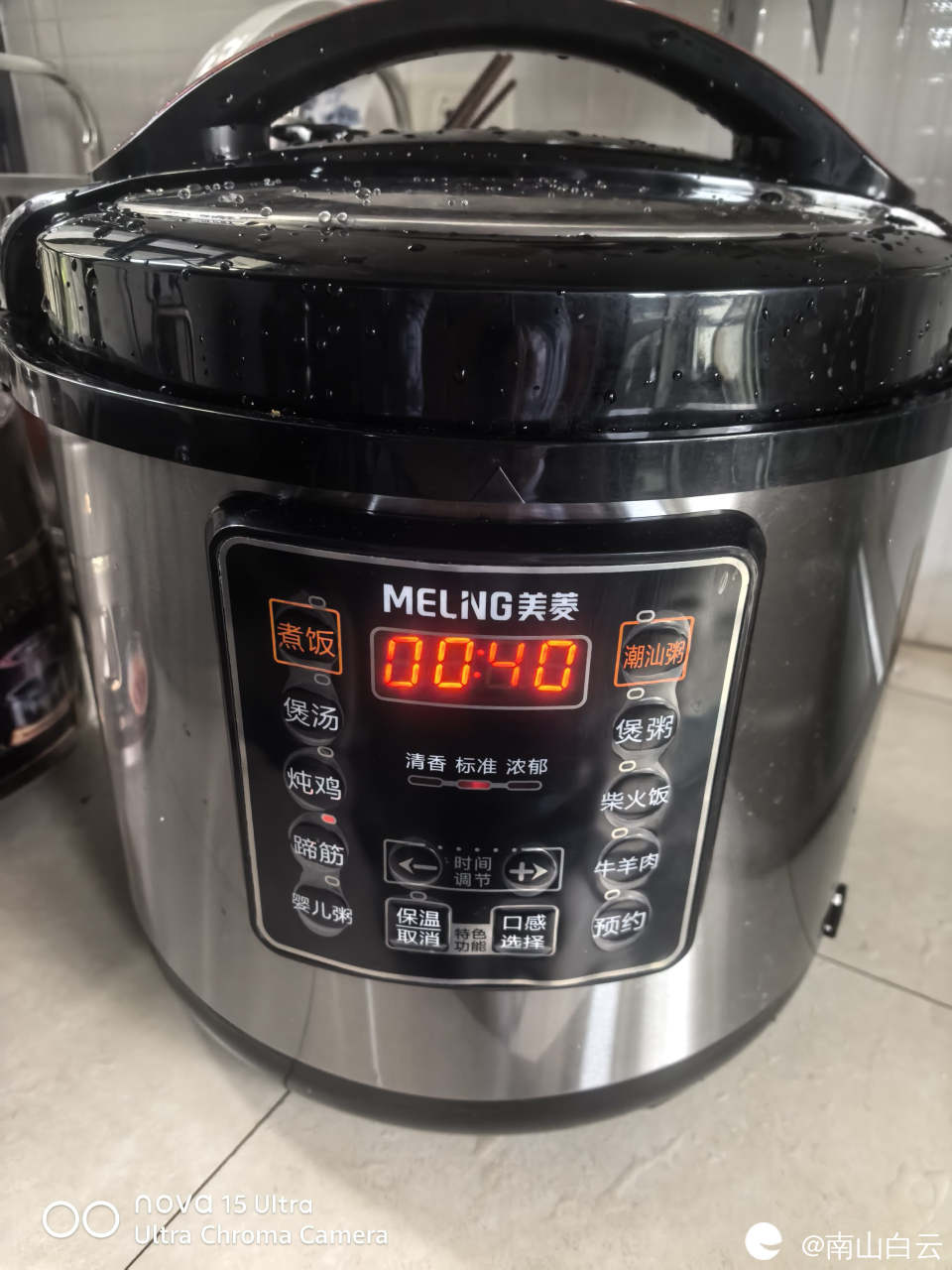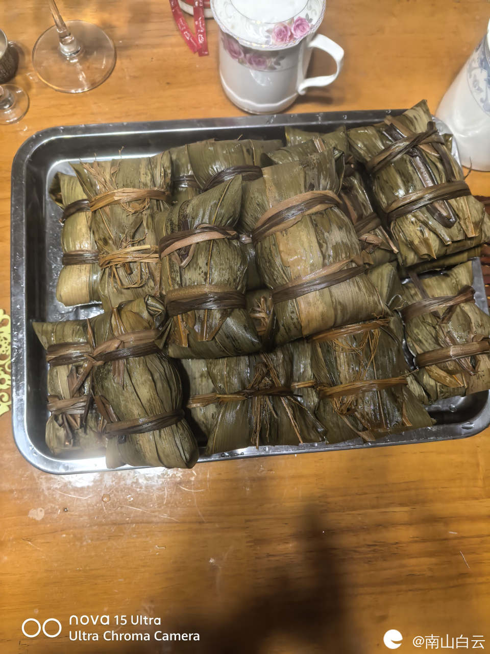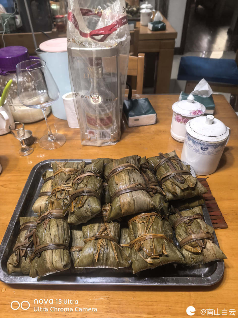 高压锅里烹饪的功能是蹄筋菜单,时间稍微慢点。最后,烹饪结束,粽子出锅。糯米与五花肉,板栗在竹叶的环境里散发魅力,正如宋大文豪苏轼的名句 棕叶香飘十里,对酒携樽俎。