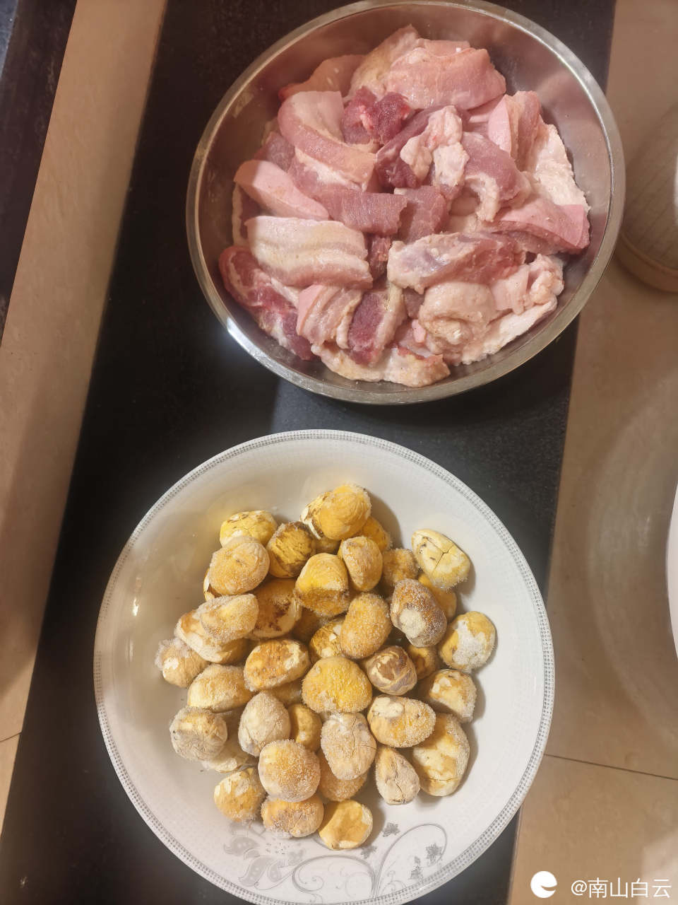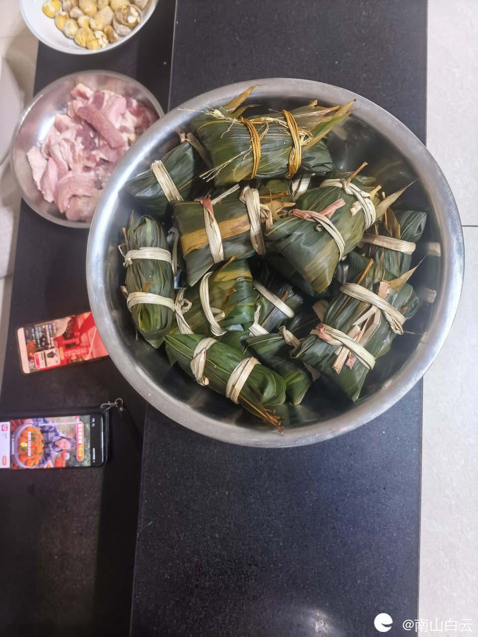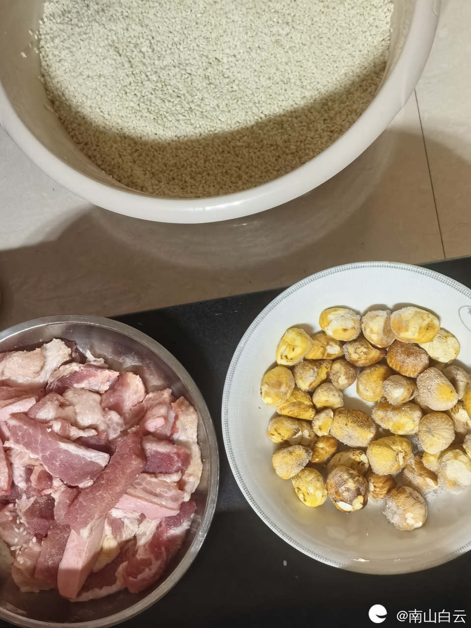 采购完成后回家整好准备工作。将五花肉洗净切好,准备板栗,洗净竹叶。