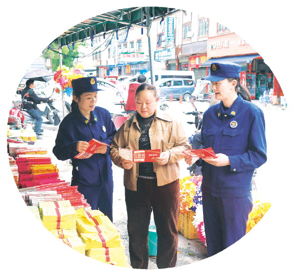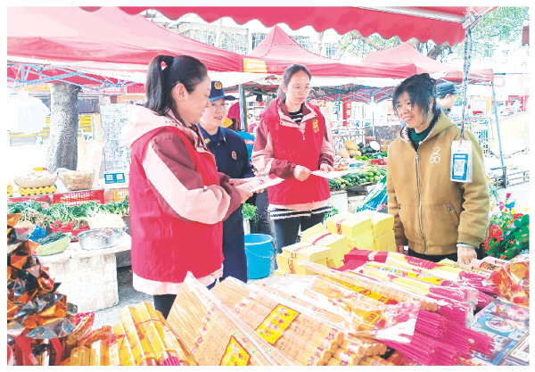 在象山区,消防救援人员联合网格员、志愿者针对清明祭祖用品销售场所开展防火宣传。    王倩 摄