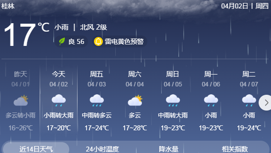 清明假期临近,全国的天气却热闹起来 中央气象台预计,4月2日至4日,广西中北部、广东等地部分地区有8~10级雷暴大风、局地伴有冰雹和短时强降水,广西、广东等局地雷暴大风最大风力可达11级。 广西气象台预计,4月2日晚上到3日白天,桂东部分地区有小到中雨,局地大雨或暴雨,桂北、桂东局地有短时雷暴大风冰雹等强对流天气。4月5日至6日,广西还有一次降雨天气过程。 具体预报 广西气象台2日发布预报: 陆地天气预报
