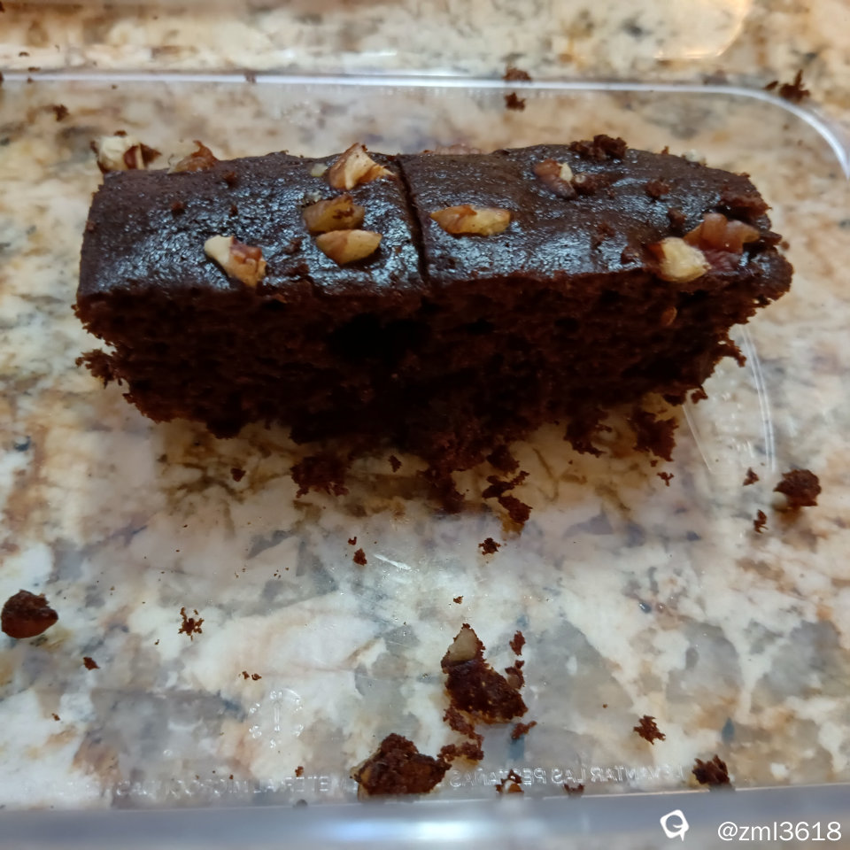 巧克力果仁蛋糕,里面还加了香蕉。使之蛋糕松软有香蕉味。香甜好吃。做了两盒,早上当早餐,孩子去打球时,拿了一盒去给球友们分享。剩下的,我拍了一张照片。
