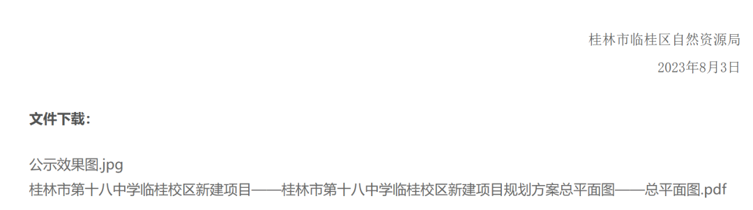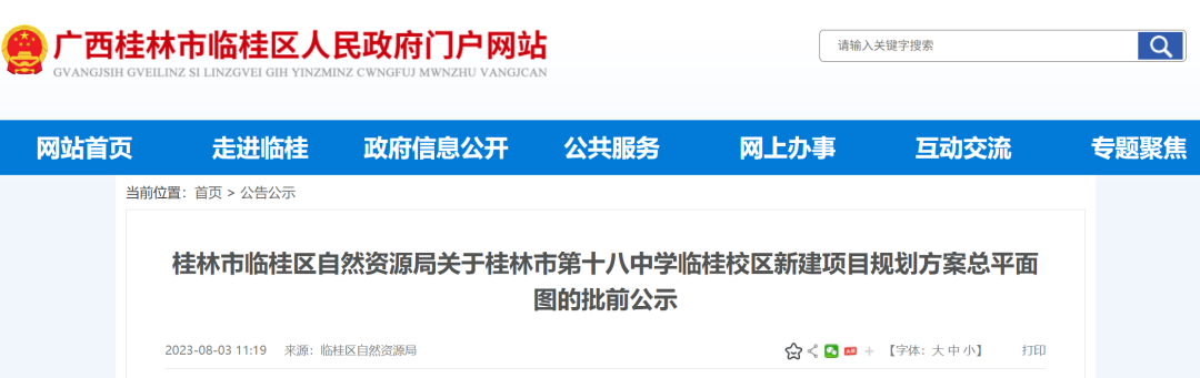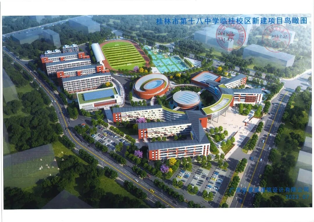 记者查询发现,2023年8月3日,临桂区自然资源局在临桂区人民政府网站公示了桂林市第十八中学临桂校区新建项目规划方案总平面图及效果图。