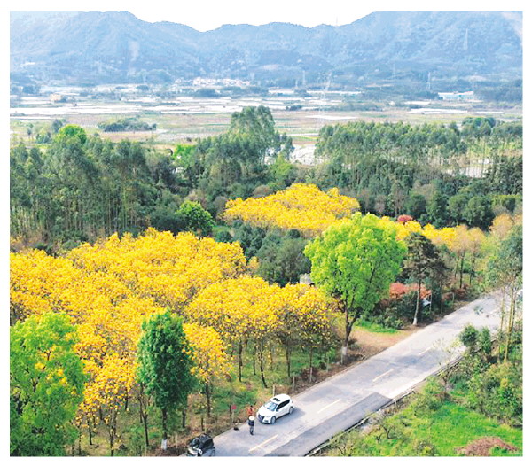 在黄花村的黄花风铃木种植区内,繁花竞相怒放、美不胜收。黄花风铃木属于紫葳科风铃木属落叶乔木,原产于巴西,如今在我国华南地区被广泛作为景观林木栽培。该品种每年3至4月迎来盛花期,开花时花瓣边缘呈自然的皱曲波浪状,金黄色的花冠质感细腻温润,花姿优雅别致,极具观赏价值。其花语蕴含感恩致谢、温柔祝福之意,自带浪漫美好的诗意氛围。