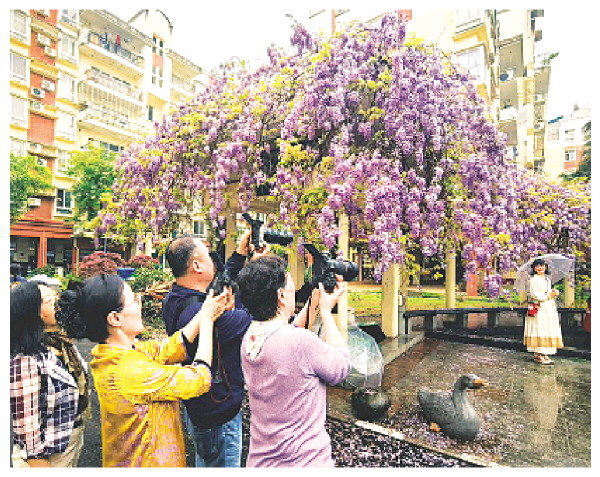 除公园外,市内多个居民小区也是紫藤花的热门打卡地。记者日前走访雉山路新洲花园时看到,这里已聚集了不少前来打卡的市民,她们身着靓丽服饰,在花下拍照留念。飘落的花瓣铺满地,枝头的露珠随风滴落,置身其中,仿佛闯入了一幅古色古香的春日画卷。据悉,该小区对外免费开放,只需向保安说明赏花来意即可进入。