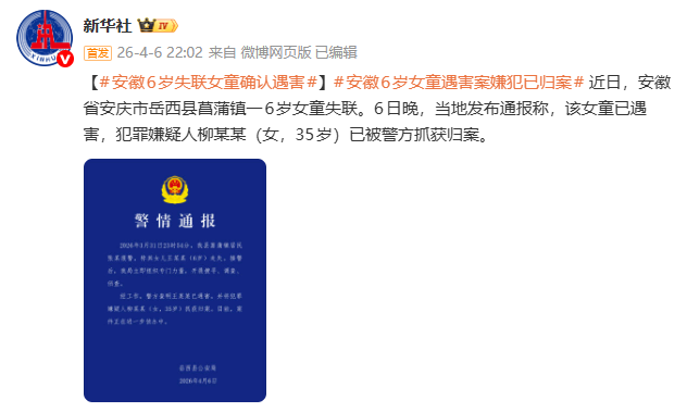 近日,安徽省安庆市岳西县菖蒲镇一6岁女童失联。6日晚,当地发布通报称,该女童已遇害,犯罪嫌疑人柳某某(女,35岁)已被警方抓获归案。