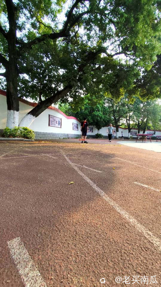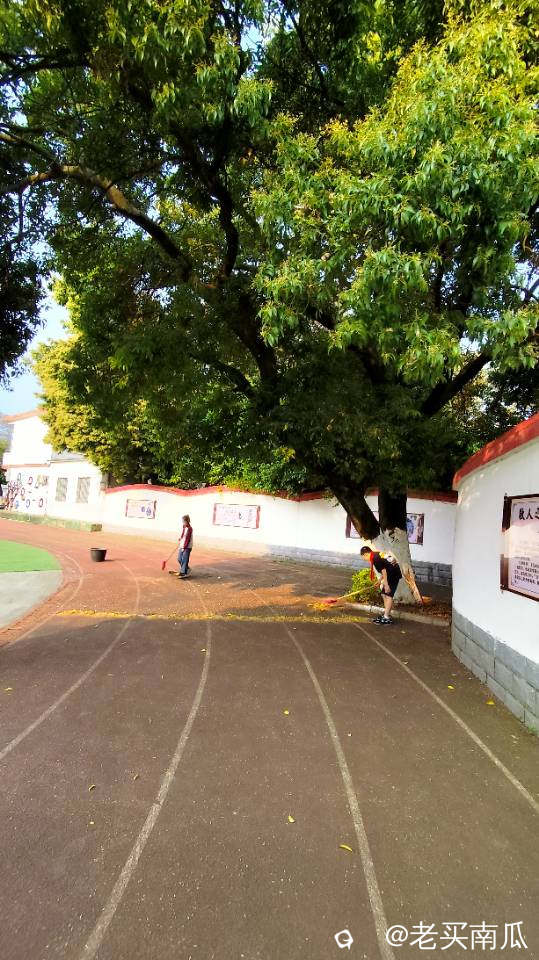 路过跑道、球场的时候,有个孩子在认真地扫地,引起了我的注意。