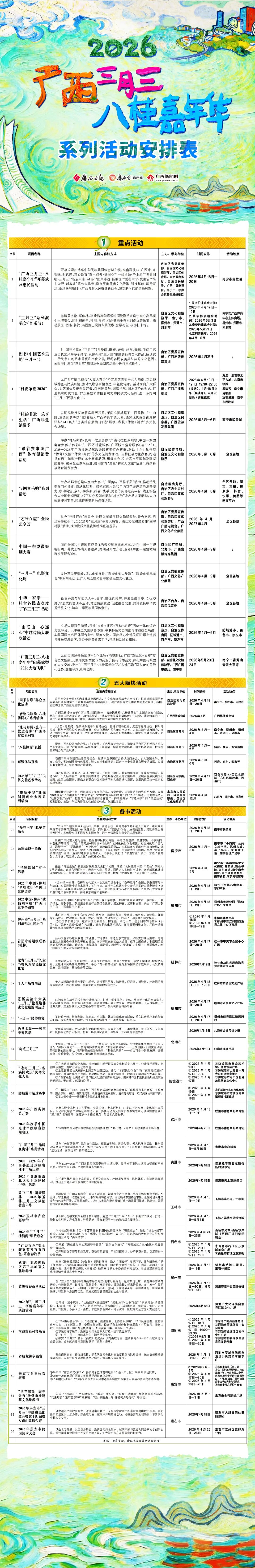 畅游畅购三月三”活动,精心打造一批特色节庆场景、精品旅游线路和便民消费举措,让全国游客在春假期间畅游八桂山水、畅购特色好物、畅享民俗荟萃。 一大波活动来袭 ★活动如有变动,请以主办方最新通知为准  来源丨广西云-广西日报记者 梁盘生 |